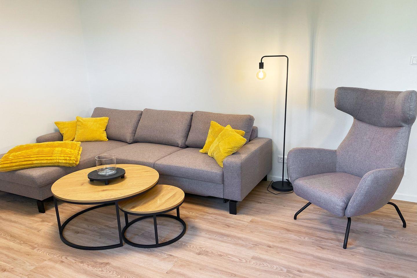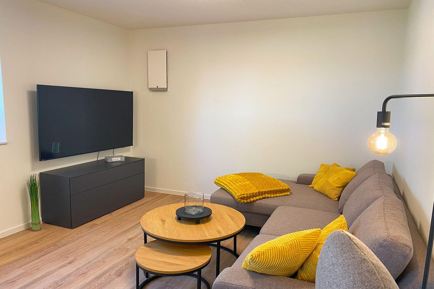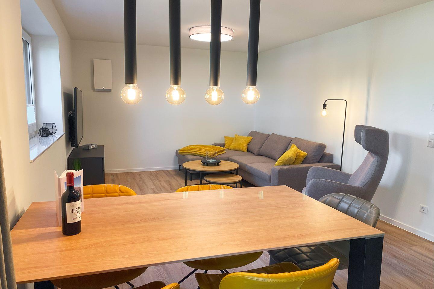 Der lichtdurchflutete Wohnbereich mit bodentiefen Fenstern und Zugang zum möblierten Balkon lädt zum Entspannen ein. Hier findest du ein gemütliches Schlafsofa (140x200 cm) für zwei weitere Gäste sowie einen Smart-TV für entspannte Abende. Die offene Küche ist modern ausgestattet – mit Backofen, Herd, Geschirrspüler, Mikrowelle, Kühlschrank mit Gefrierfach, Kaffeemaschine, Wasserkocher und Toaster. Am großen Esstisch ist Platz für gemeinsame Mahlzeiten und Spieleabende.