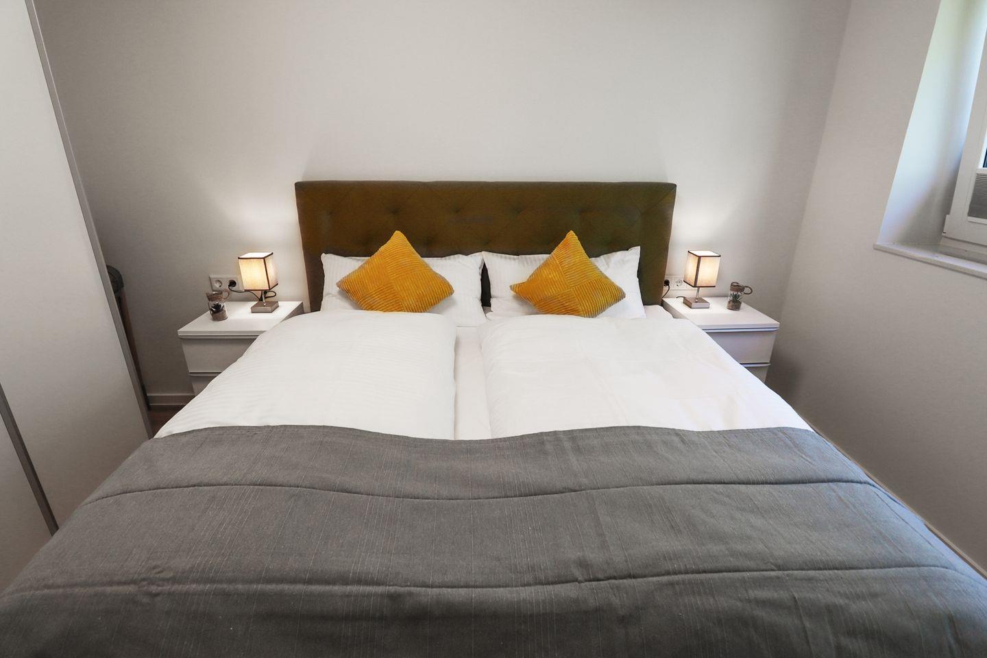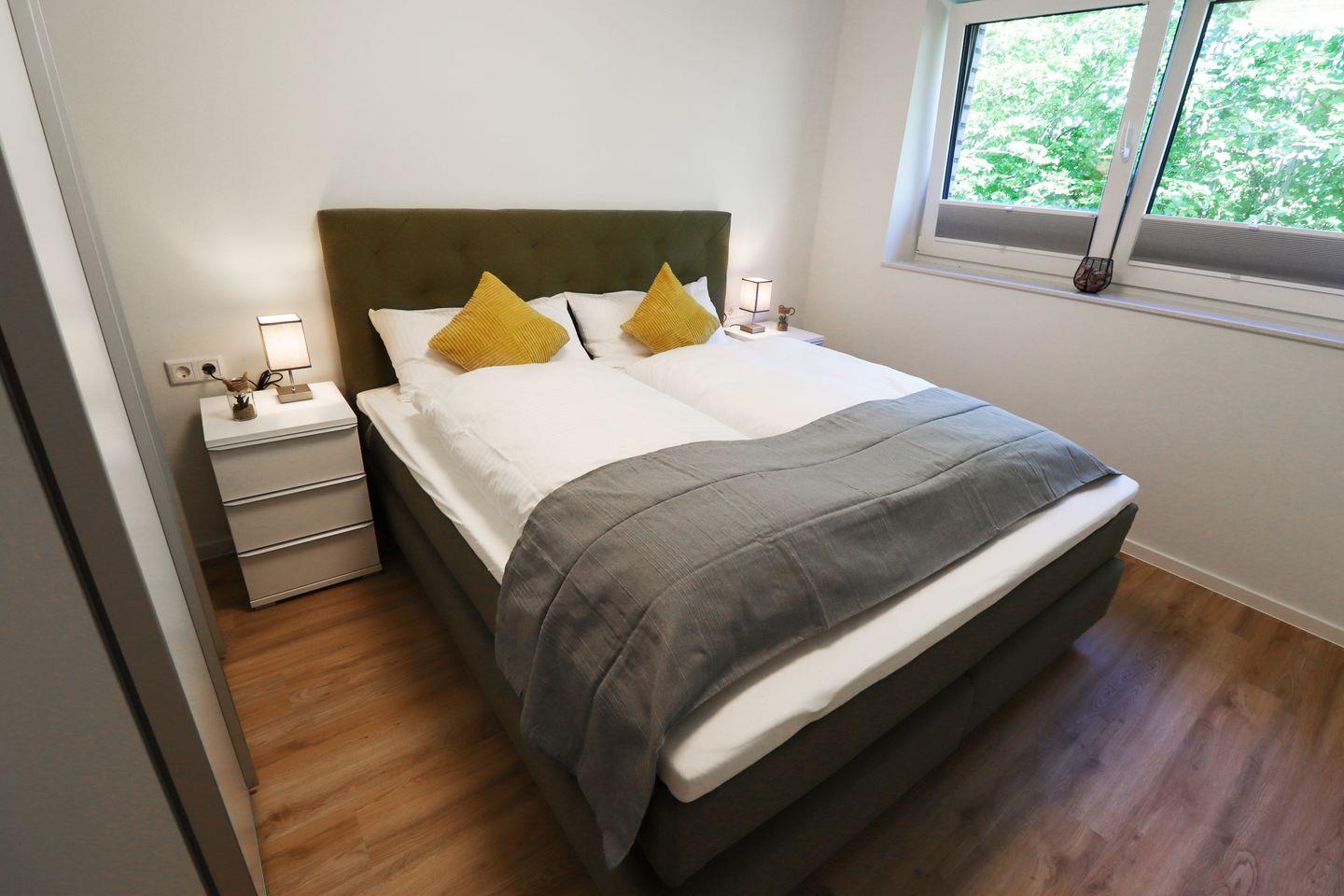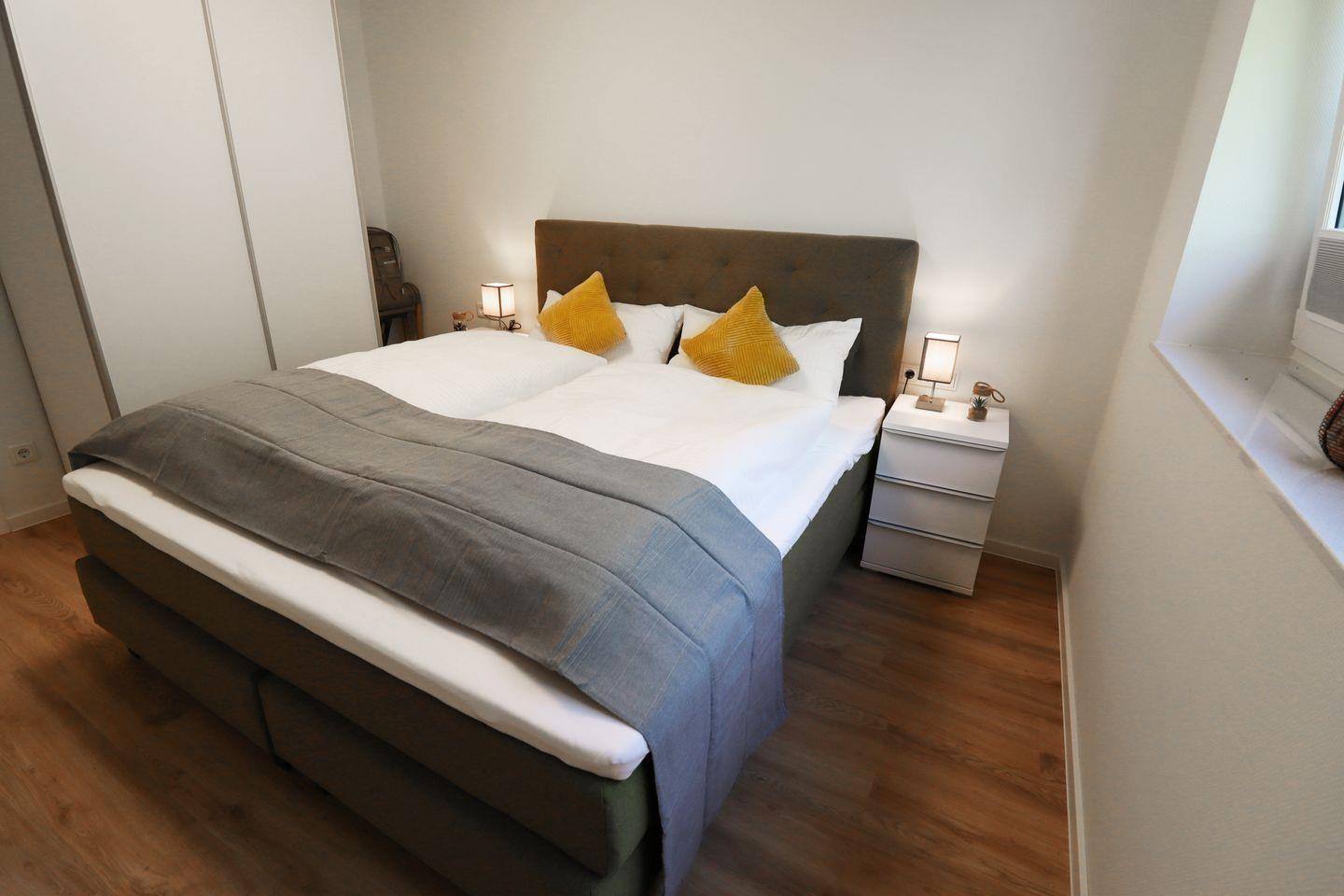 Zwei Schlafzimmer mit hochwertigen Boxspringbetten (180x200 cm) und Smart-TV sorgen für erholsame Nächte. Plissees zum Verdunkeln schaffen eine angenehme Schlafatmosphäre.