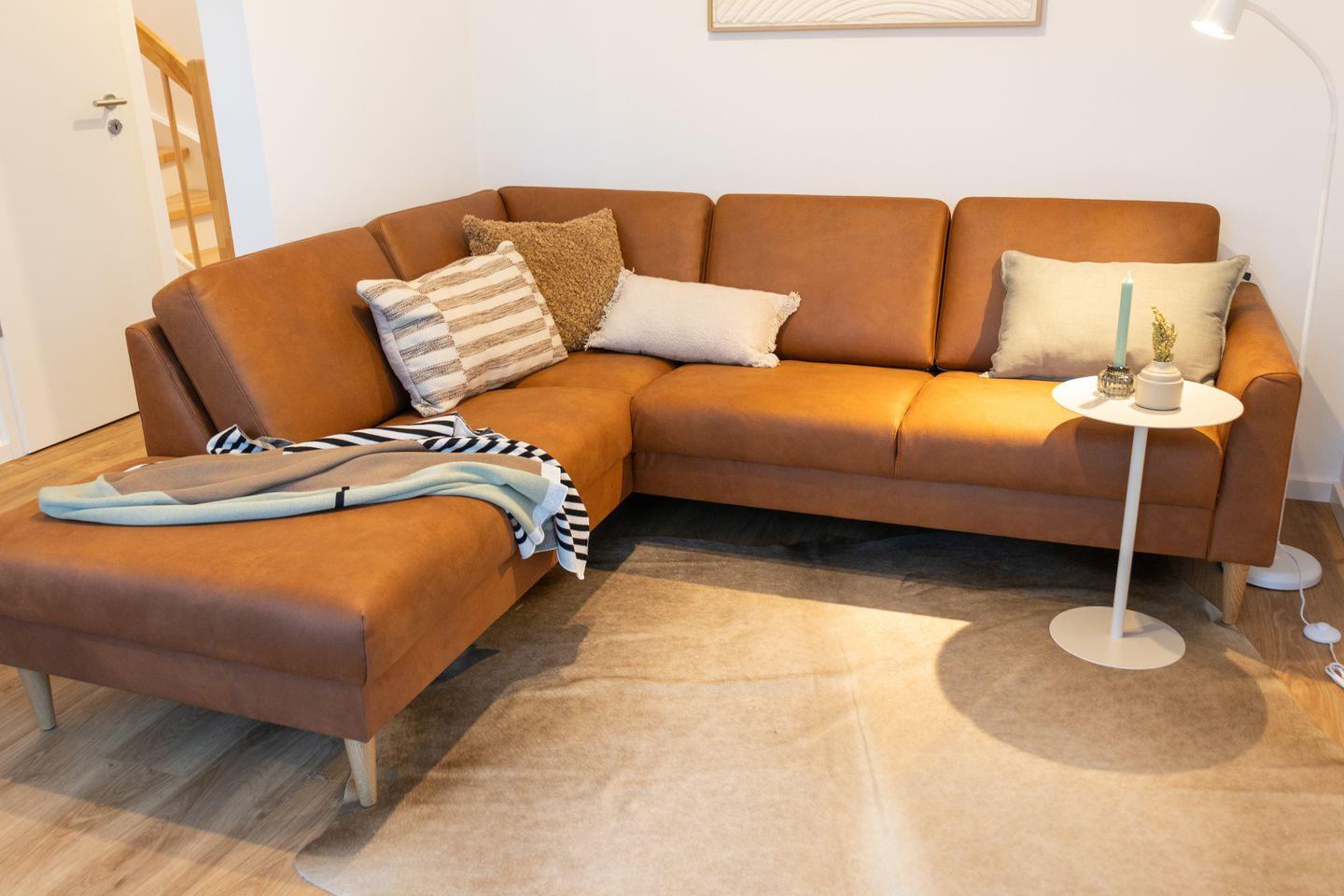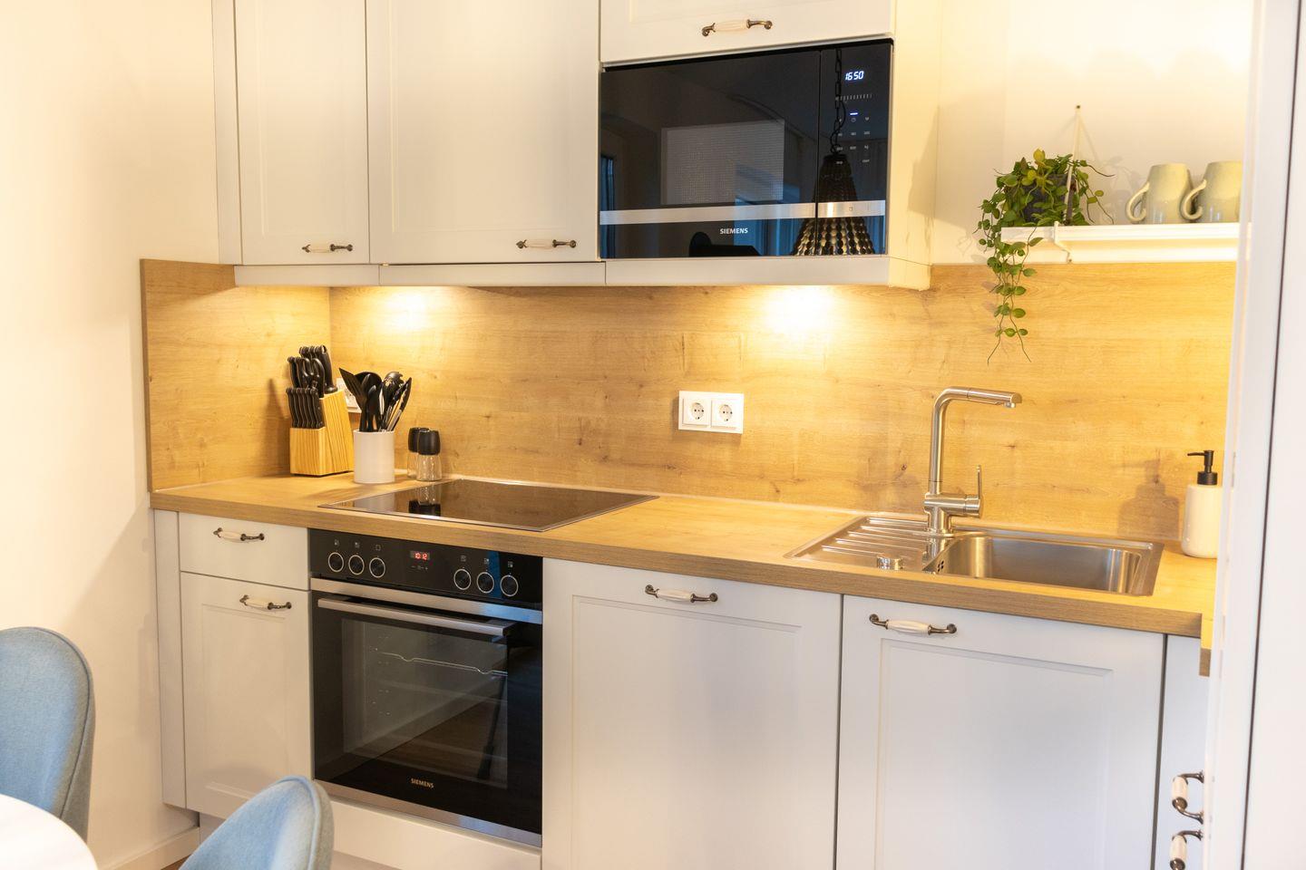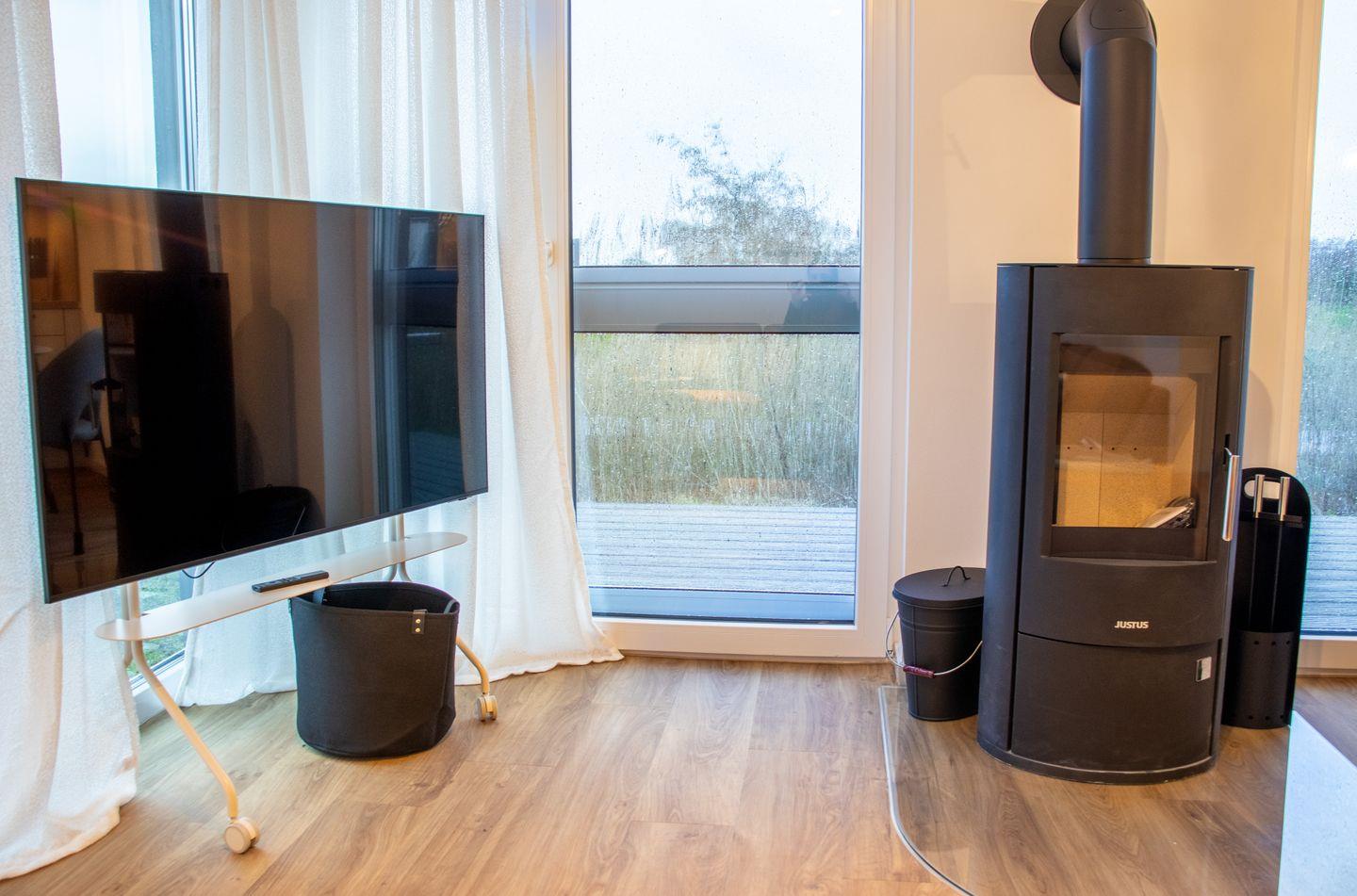 Im offenen Wohnbereich erwarten dich große bodentiefe Fenster, ein bequemer Sitzbereich mit Smart-TV sowie ein Kaminofen für gemütliche Abende. Die moderne, voll ausgestattete Küche mit Spülmaschine, Induktionskochfeld und Backofen lädt zum gemeinsamen Kochen ein. Von hier aus gelangst du direkt auf die Terrasse mit Garten – perfekt für Frühstück im Freien oder laue Sommerabende.