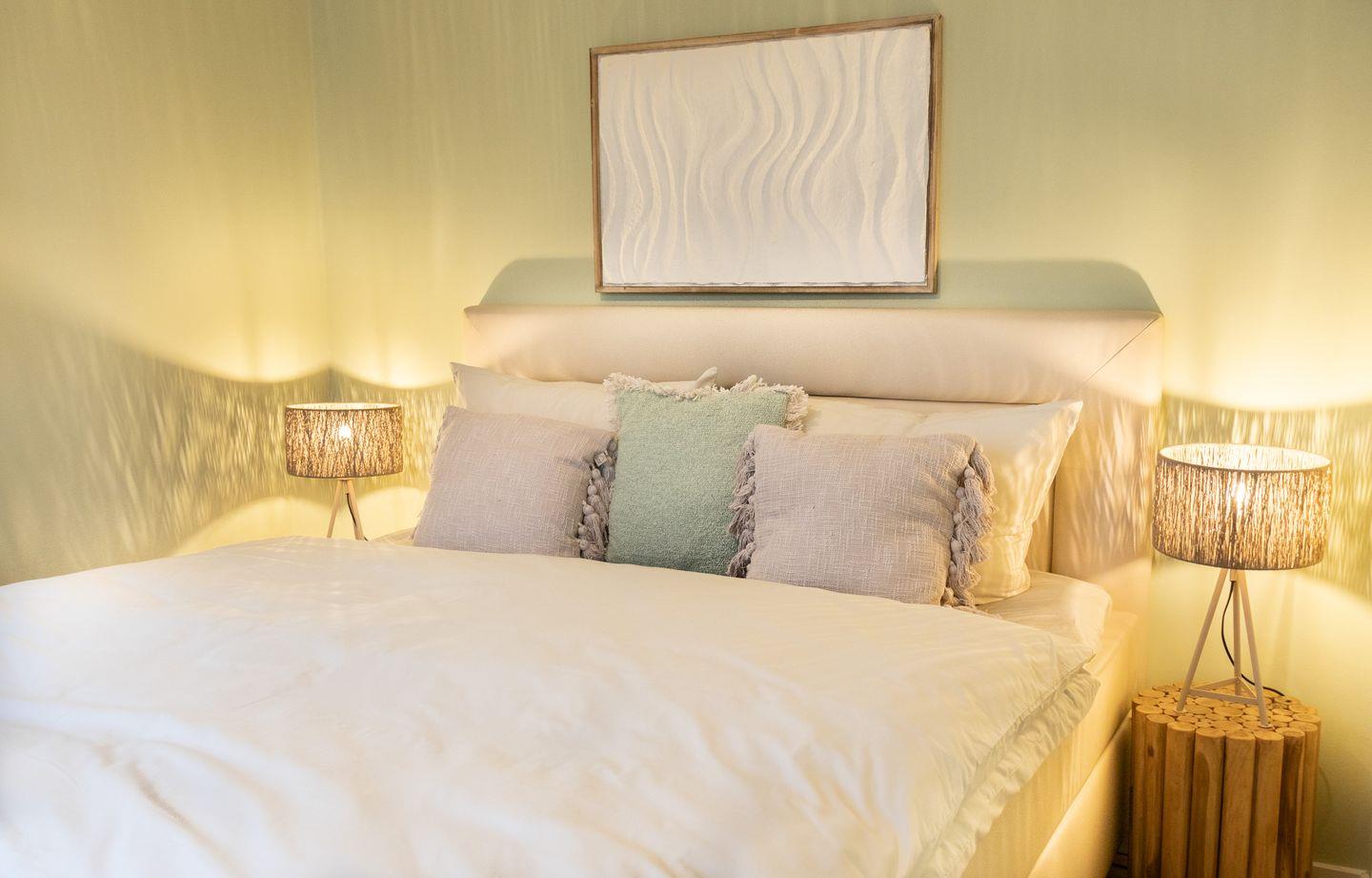Das Obergeschoss bietet zwei Schlafzimmer: Eines ist mit einem komfortablen Boxspringbett (180x200 cm) ausgestattet und hat direkten Zugang zur Dachterrasse. Im zweiten Schlafzimmer sorgt ein Hochbett mit zusätzlicher Ausziehmatratze für flexible Schlafmöglichkeiten – ideal für Kinder oder Freunde. Vorhänge in beiden Zimmern garantieren erholsamen Schlaf.