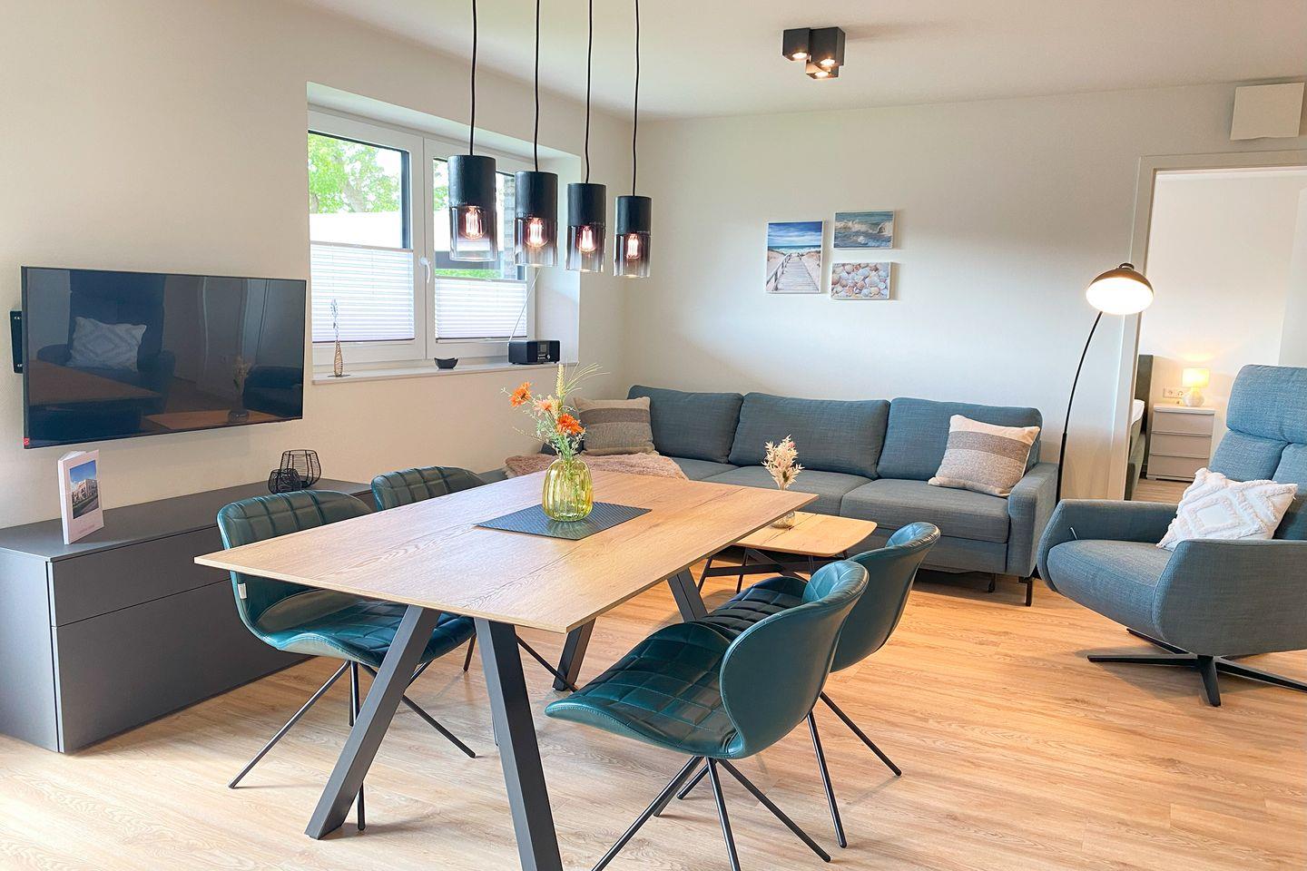 Der offene Wohnbereich ist gemütlich und stilvoll eingerichtet. Auf dem großen Sofa kannst du es dir mit einem Buch bequem machen oder den Smart-TV genießen. Der angrenzende Essbereich lädt zum gemeinsamen Frühstück oder Spieleabend ein. Vom Wohnzimmer aus gelangst du direkt auf den sonnigen Balkon mit Blick ins Grüne.