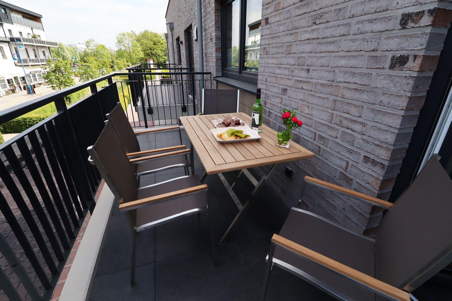 Der offene Wohnbereich mit hochwertigem Schlafsofa, großem Smart-TV und direktem Zugang zum Balkon lädt zum Entspannen ein. Helle Fenster schaffen eine freundliche Atmosphäre, die moderne Küche ist voll ausgestattet – ideal für Kochabende, Frühstück in der Sonne oder Spiele mit den Kids.
