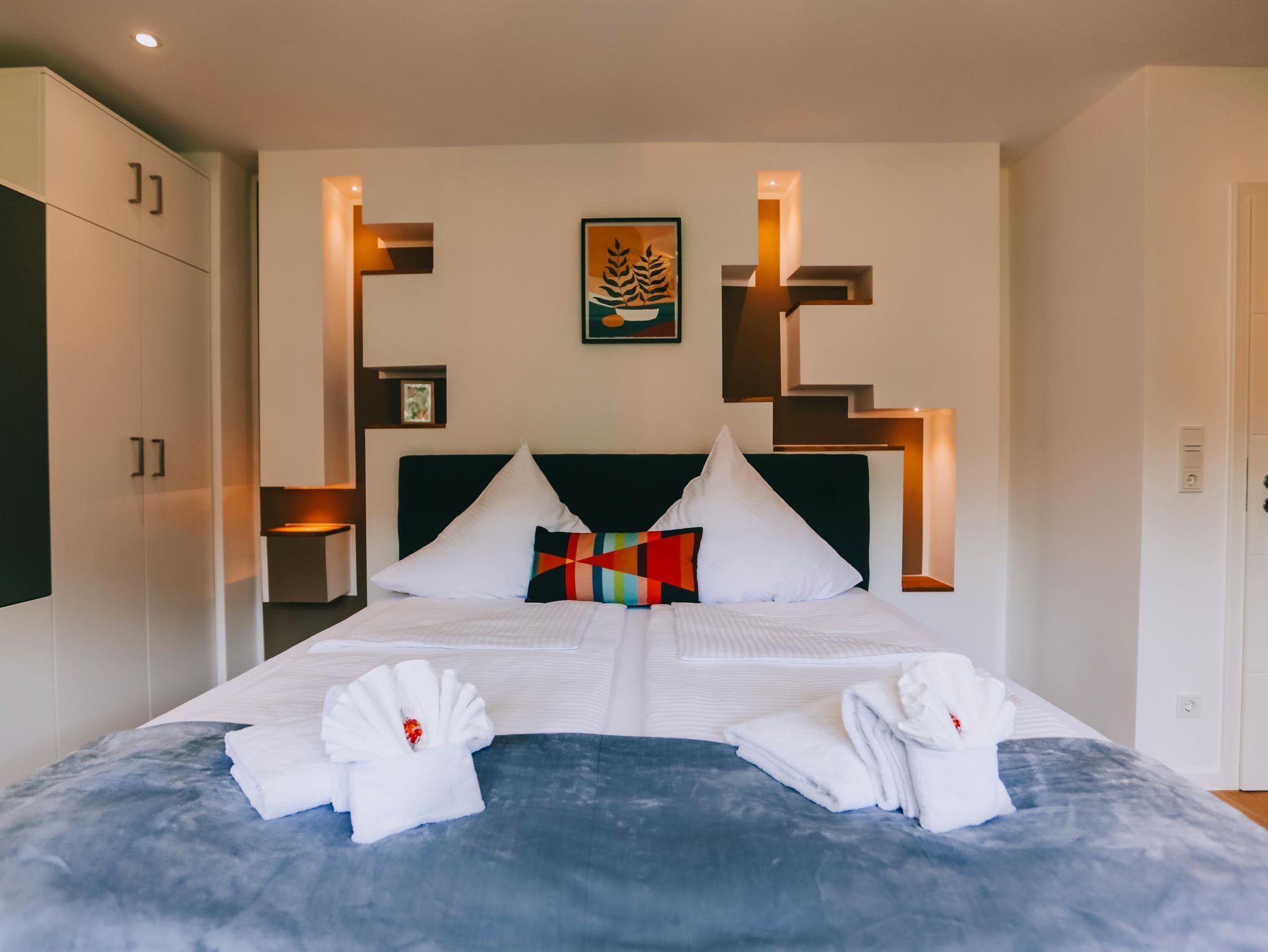 Die Wohnung ist ganz neu, mit hochwertigem Echtholz Eiche Parkettboden, 1 modernes Badezimmern mit ebenerdiger Dusche. Die Schlafzimmer sind mit Boxspringbetten mit neuen hochwertigen Matratzen sowie Sommer – Daunendecken in Komfortgröße ausgestattet. Sollte es mal etwas kühler sein gibt es zusätzlich auch kuschelige Fleecedecken. Neben kostenlosem W-Lan gibt es einen Flachbild-Sat-TV und eine Musikanlage mit Radio und Bluetooth. Eine neue, luxuriös ausgestattete Küche mit Geschirrspüler, Kühlschrank, Ceran Kochfeldherd, Backofen, Mikrowelle, Wasserkocher, Kaffeemaschine, Eierkocher, hochwertiges Geschirr und Besteck, Gläser aller Art und von allem viel mehr als Ihr benötigt Schirmständer mit 2 Automatikschirmen, Tresor für Deine Wertsachen und Papiere, Große Auswahl an Büchern, Spielesammlungen. Auf Anfrage stellen wir Euch ein Kinderbettchen und einen Hochstuhl in die Wohnung. Balkon mit Loungemöbeln, großer Garten mit Rasenflächen. Eine große Garage bietet Platz für Eure mitgebrachten Fahrräder, sowie Ladestation für Eure E-Bikes. Eine Wallbox ermöglicht das Laden Deines Elektroautos. Zur Begrüßung schenken wir Euch eine Flasche Riesling aus unserem eigenen Weingut Römerhof. In unserer zweiten Location „Moselblick am Waldrand, Zur Gonzlay 19, Stadtteil Wolf,