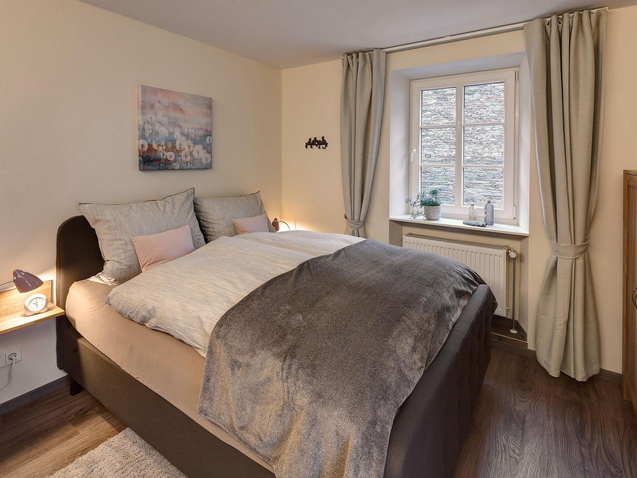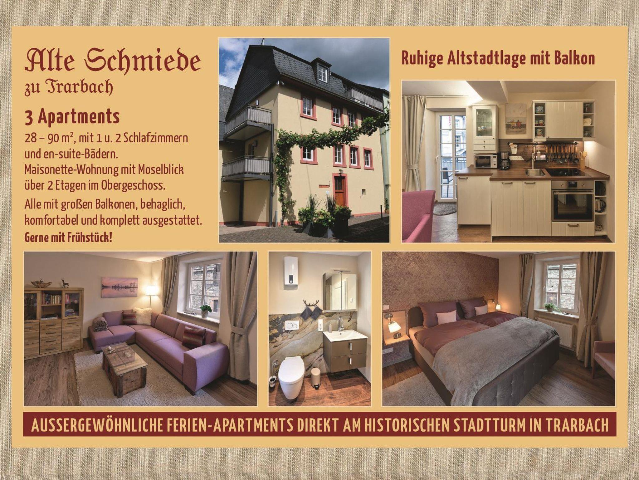 Unsere liebevoll renovierte Alte Schmiede ist ein moseltypischer Altbau in verkehrsberuhigter Lage im Zentrum der Altstadt. Die Apartments sind im modernen Landhausstil edel und individuell eingerichtet: Viel Licht, hochwertige Möbel und ein großer Balkon mit unschlagbarem Ausblick auf den historischen Stadtturm, die Grevenburg, die Weinlage Taubenhaus und das Schlösschen Sonora.