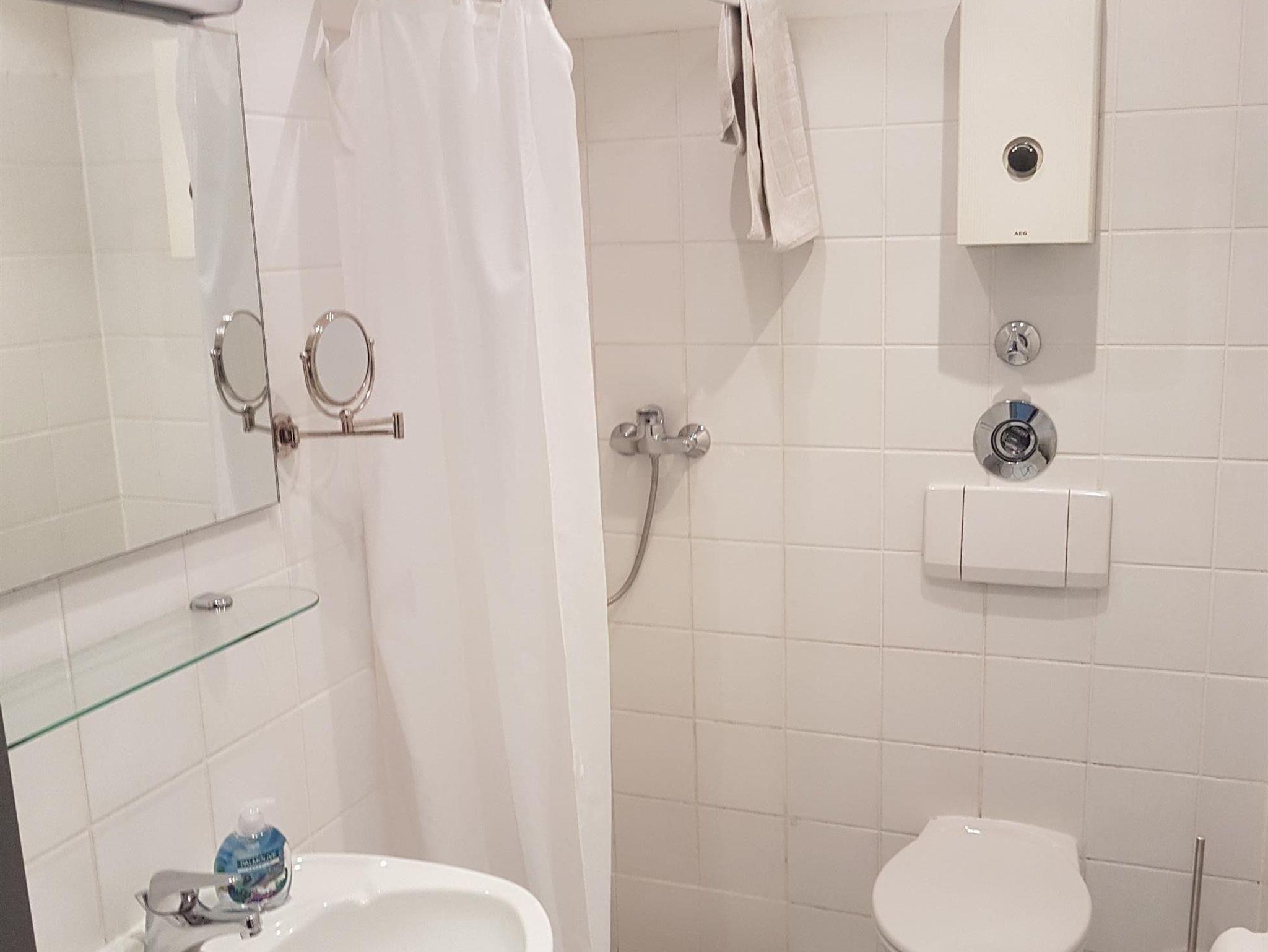 Die Ferienwohnung A12 im Erdgeschoss ist ein schönes, neumöbliertes 1-Zimmer-Appartment von 30 m², welches mit 2 Personen bewohnt werden kann. Das Wohn-/ Schlafzimmer ist mit einem Doppeldiwanbett sowie einer Pantryküche (Herd, Kühlschrank, Kaffeemaschine, Toaster, Wasserkocher) ausgestattet. Es verfügt zudem über einen Ausgang zum kleinen Balkon mit Blick ins Grüne. Bad mit Dusche und WC.