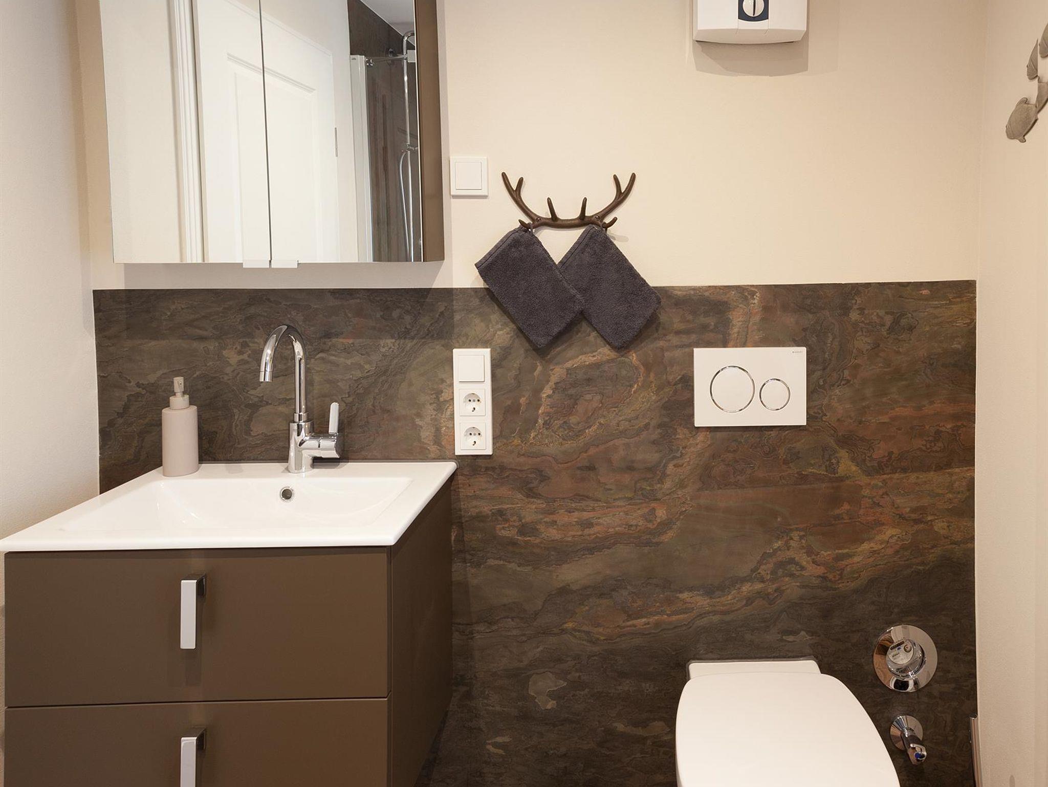 Das großzügige Bad haben wir modern und mit großflächigem echten Schiefer gestaltet – mehr Mosel geht nicht!