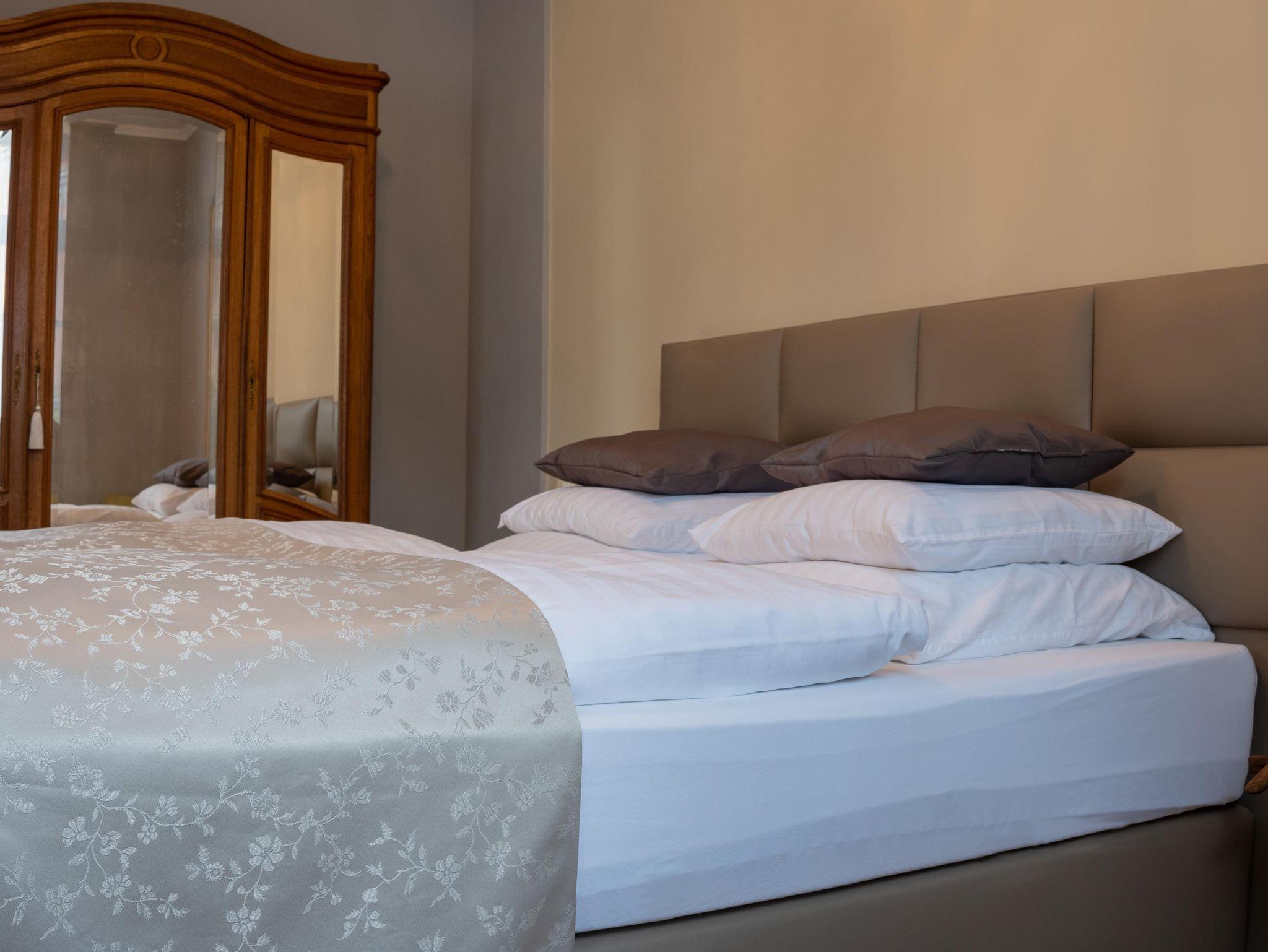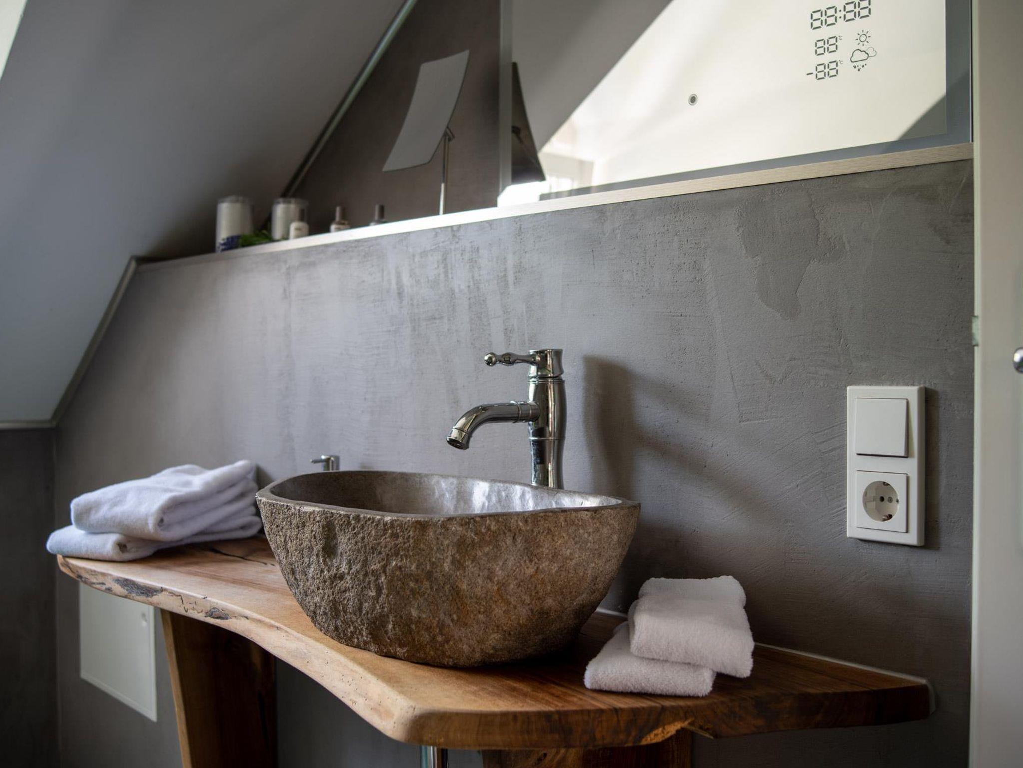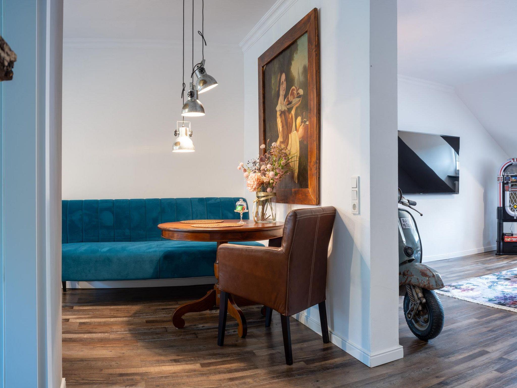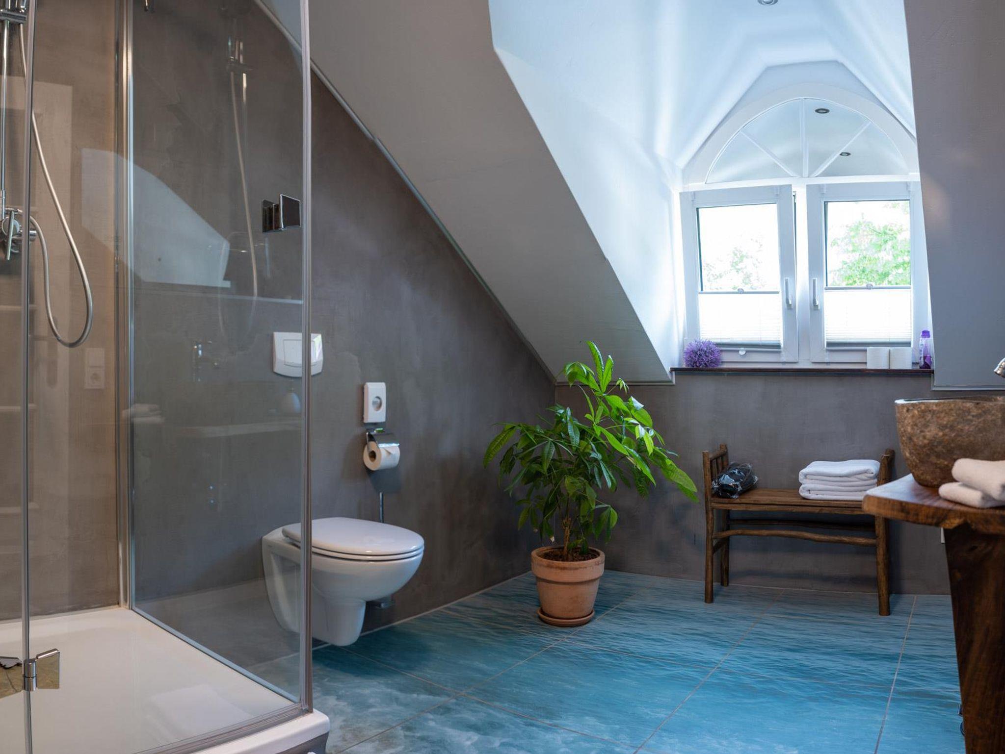 Der Aufstieg in die dritte Etage lohnt sich nicht nur wegen der sehr schönen Aussicht auf die Stadt, die Weinberge und oder das Wahrzeichen der Stadt, die Grevenburg. Das Bijou in der dritten Etage lässt keine Wüsche offen. Ein Ort zum Träumen ist nicht nur das romantische Schlafzimmer, sondern auch das sehr spezielle Badezimmer mit Regenwasserdusche. Die Highlights in diesem Apartment die Moped-Bar oder auch die Rock ola Musikbox.