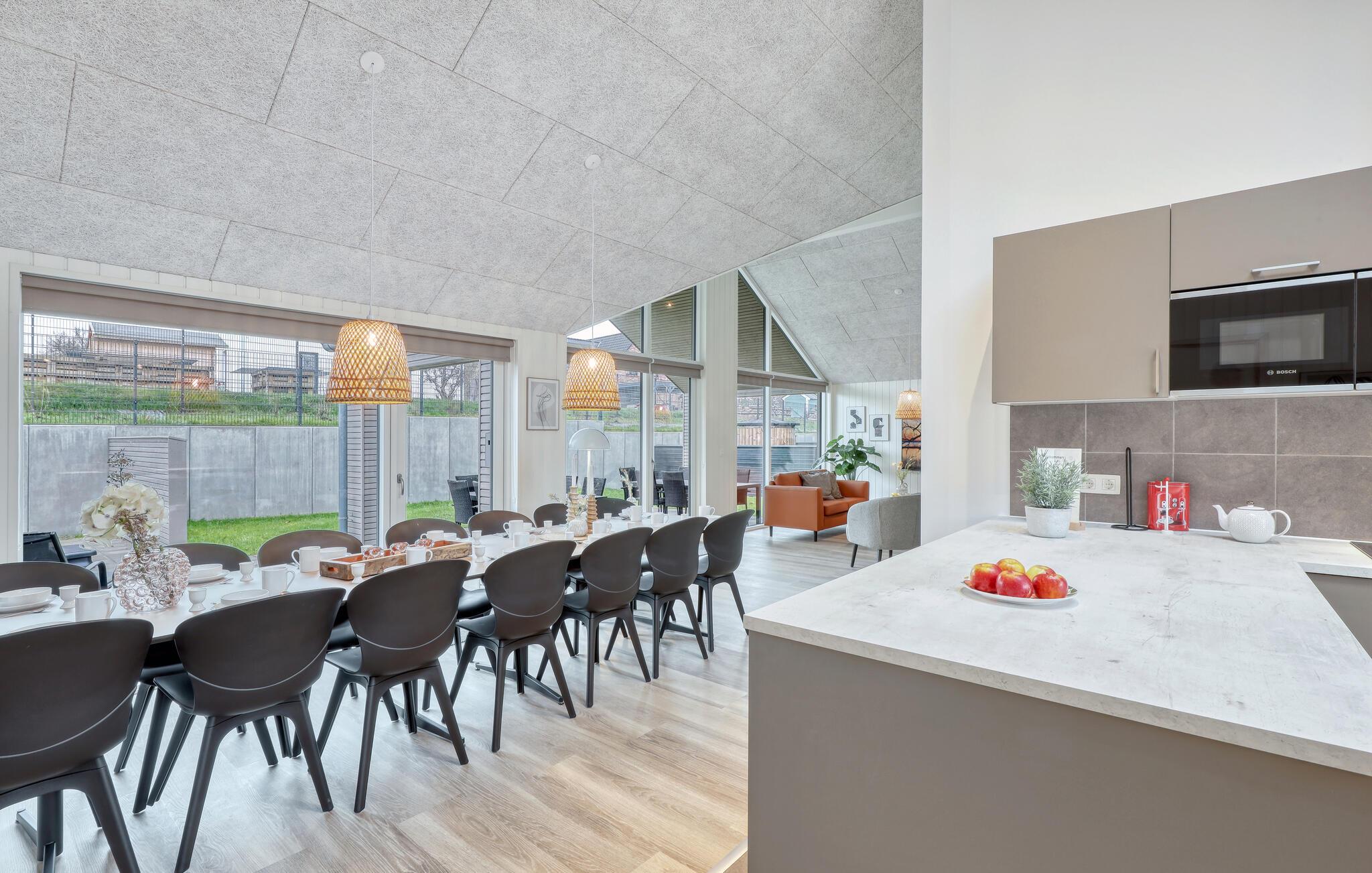 Dette moderne feriehus venter jer i en lille feriehusby nær Trams am See og ikke langt fra Tramser See. Det byder på et lyst interiør af høj kvalitet og masser af plads og komfort til flere familier. Husets hjerte er den skønne opholdsstue med åbent køkken og plads til at bruge timevis på at lave mad sammen. I kan nyde de lækre måltider sammen i en hyggelig atmosfære ved det store spisebord. Nyd et spil bordtennis, bordfodbold eller dart i aktivitetsrummet og forfrisk jer selv med en kold drink i baren. Den smukke pool med vandrutsjebane inviterer unge og gamle til at tilbringe timevis af eventyr. Eller nyd en massage i spabadet og slap af i den private sauna.