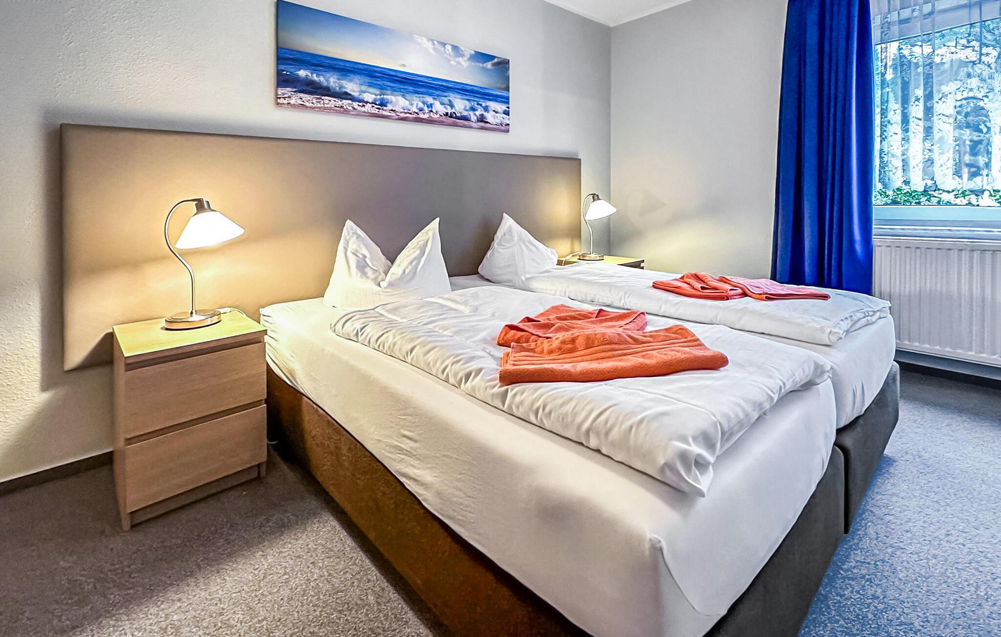 De fire ikke-ryger ferielejligheder ligger i et feriehus på en grund på cirka 1.400 kvadratmeter centralt i Østersøferiestedet Trassenheide. Der er omkring 1,6 km til Østersøstranden. Butikker, restauranter og caféer er inden for få hundrede meter.Alle lejligheder blev omfattende moderniseret og nyindrettet i 2020. Den 45 kvm store 2-værelses lejlighed til 2 personer ligger i husets stueetage og kan nås via en central trappe. Lejligheden har opholdsstue med spisebord og åbent tekøkken (polstrede møbler, fladskærms-tv, spisebord, el-komfur, ovn, køleskab med fryser, mikroovn, diverse køkkenmaskiner), soveværelse (dobbeltseng) og et badeværelse med brus/toilet. Fra stuen er der udgang til den møblerede terrasse og den tilstødende lille havegrund. En barneseng og høj stol kan stilles til rådighed for små børn. WiFi er også tilgængeligt. Der er parkeringsplads, cykelstativer og central grillplads på naboejendommen til rådighed for hver lejlighed på ejendommen. Den samlede pris inkluderer slutrengøring, sengelinned, håndklæder samt vand- og energiforbrug. I feriestedet Trassenheide ved Østersøen er feriegæster forpligtet til at betale en spaskat (betales kontant på stedet). Trassenheide, badebyen i den nordlige del af øen Usedom, er kendetegnet ved sin fine sandstrand. Nudist- og hundebadestrand i nærheden. Stedet er forbundet med øens cykelnet. Begivenheder og koncerter finder sted på promenaden om sommeren.