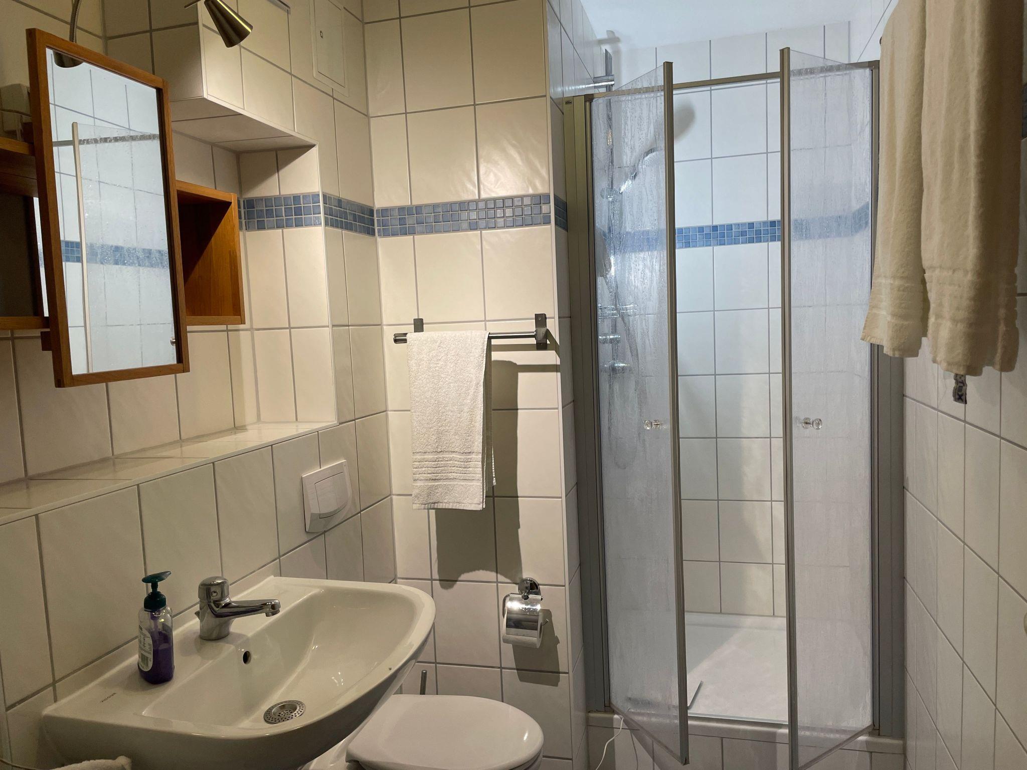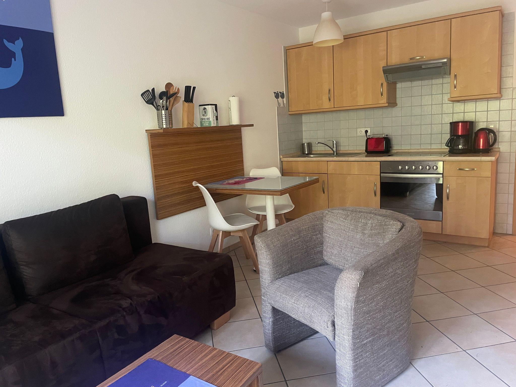 The apartment is on the ground floor, with just four steps up to the front door. There is underfloor heating for the winter. Most guests come as a couple, or a couple with one to two children. It is also possible to accommodate four adults, but then space is tight. It has a bedroom with a double bed and a wardrobe, and a living room with a flatscreen TV, a DVD/CD player and a sofa bed also suitable for two adults. On the other side of the living room there is a kitchen with a fridge, stove, oven, toaster and coffee machine. There is also a little table for dining indoors. Three people can sit at the table indoors, or four people outside on the terrace. There is a bathroom with a shower and toilet. The little hallway provides space for coats and shoes. It is narrow, but you could park a bicycle here for the night, or dry towels there on the clothes stand. Beach towels, hand towels and bed linen are provided. The interior is tasteful.
