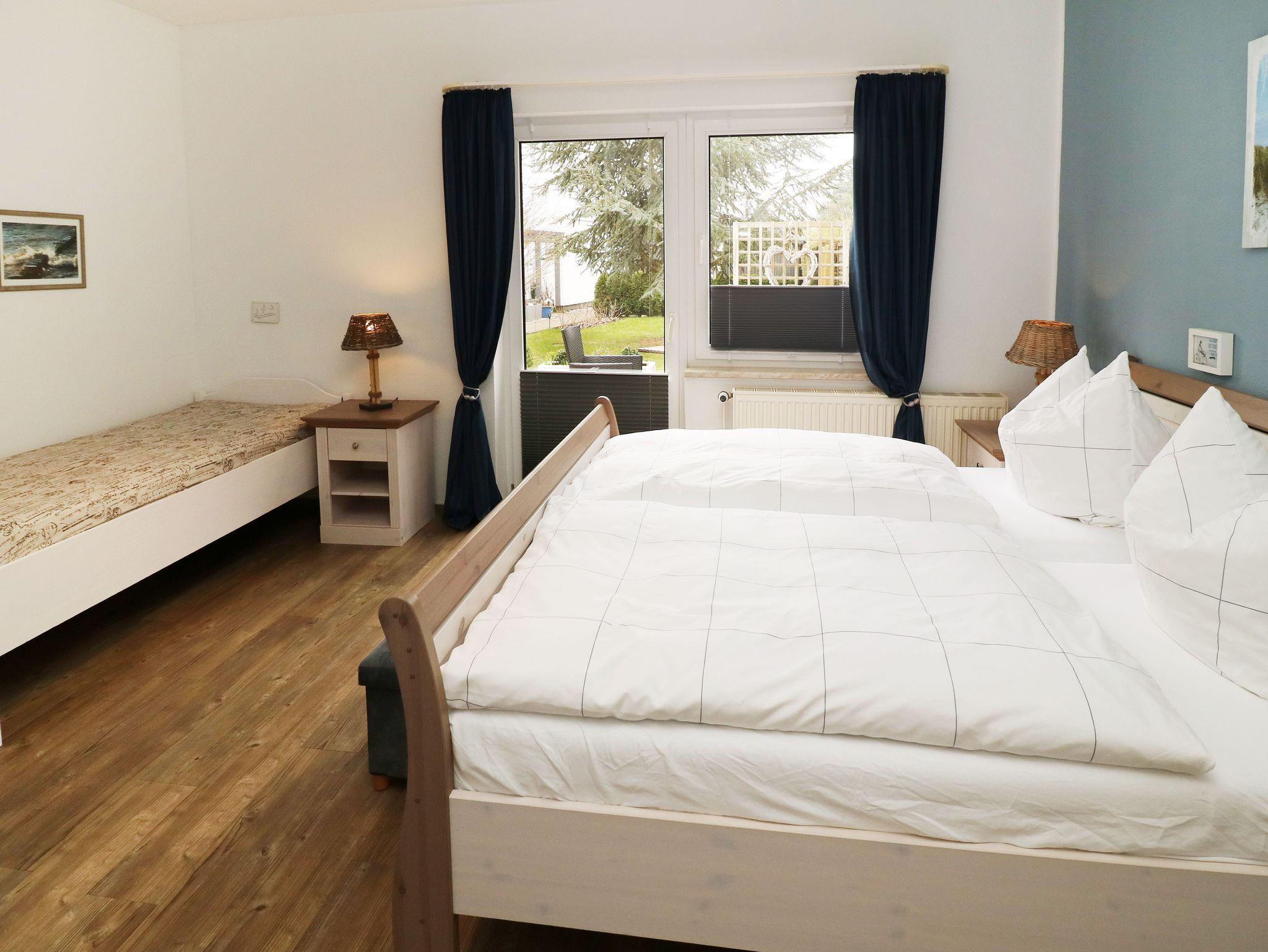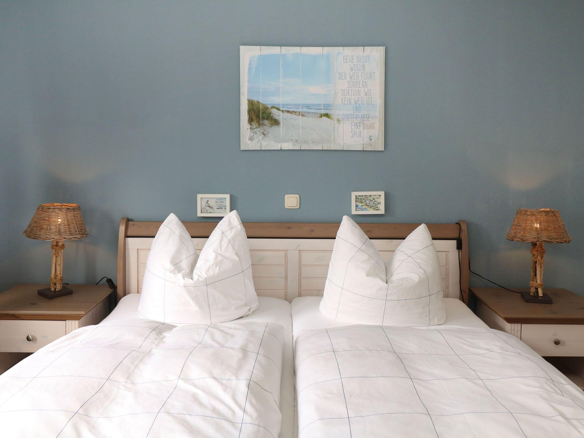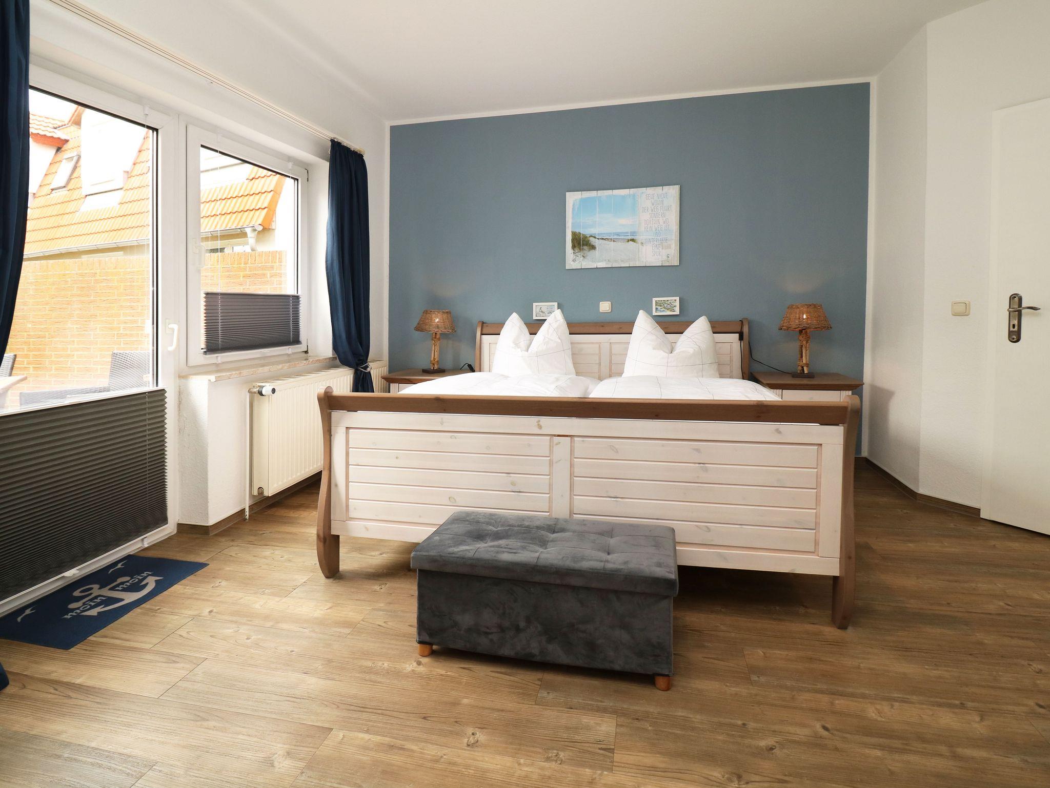 Das maritim eingerichtete Schlafzimmer verfügt über ein Doppelbett (180x200cm) sowie über ein Einzelbett (90x200cm) -