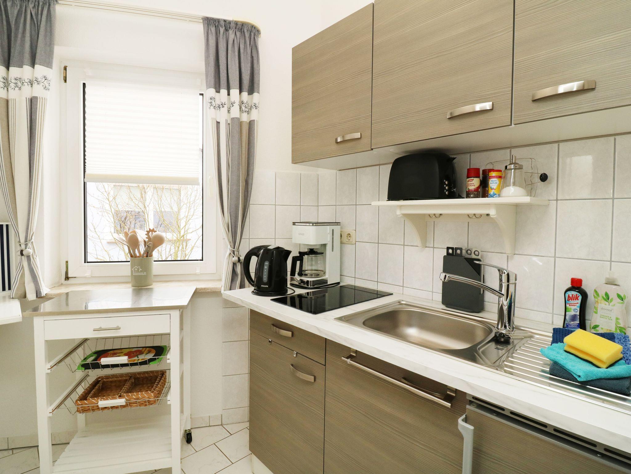 einem Kühlschrank mit Gefriermöglichkeit und einer kompletten Küchenausstattung. Dazu gehören auch Kaffeemaschine, Wasserkocher und Toaster.