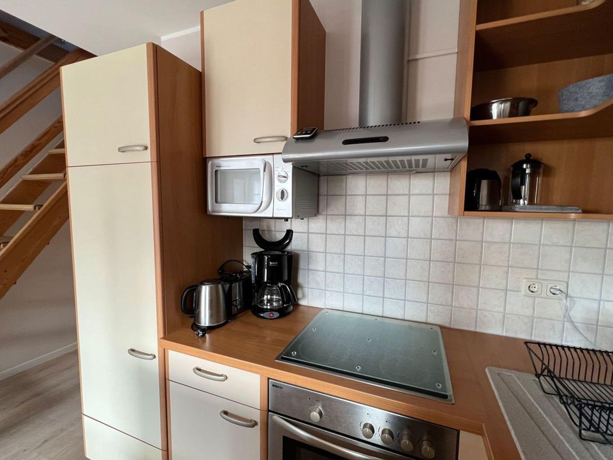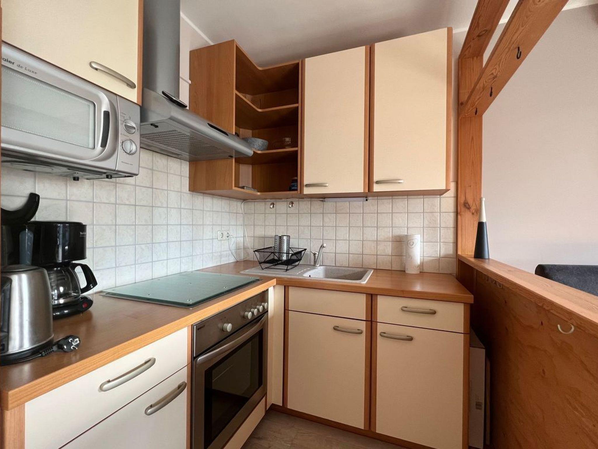 Die helle Wohnung empfängt Sie mit einem gemütlichen Wohn-/Esszimmer sowie einer gut ausgestatteten offenen Küche (Backofen, 4-Zonen-Cerankochfeld, Mikrowelle, Kaffeemaschine, Toaster, Wasserkocher).