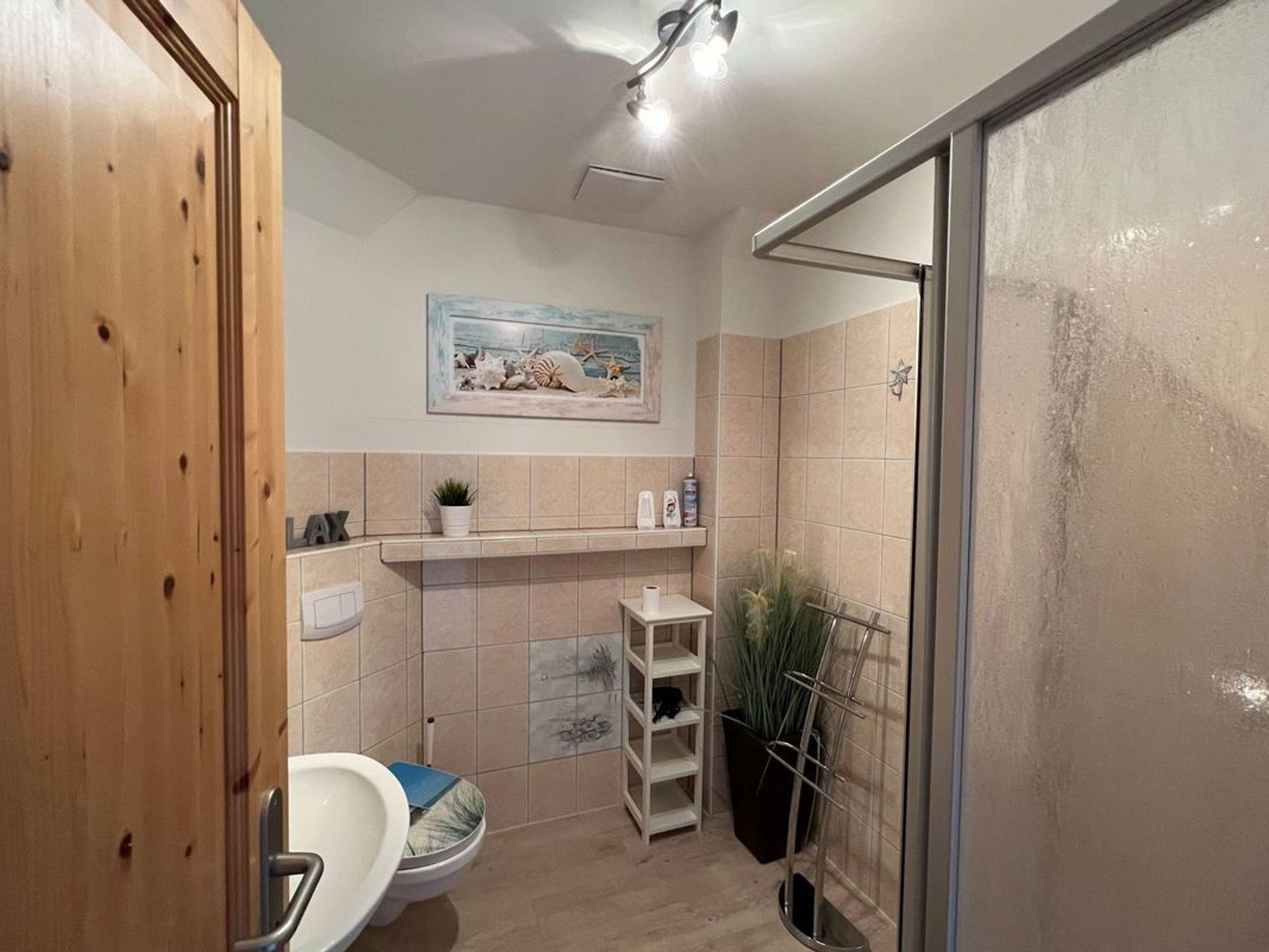 • ein Badezimmer mit WC/Dusche und ein Gästebad im oberen Bereich (nur WC)