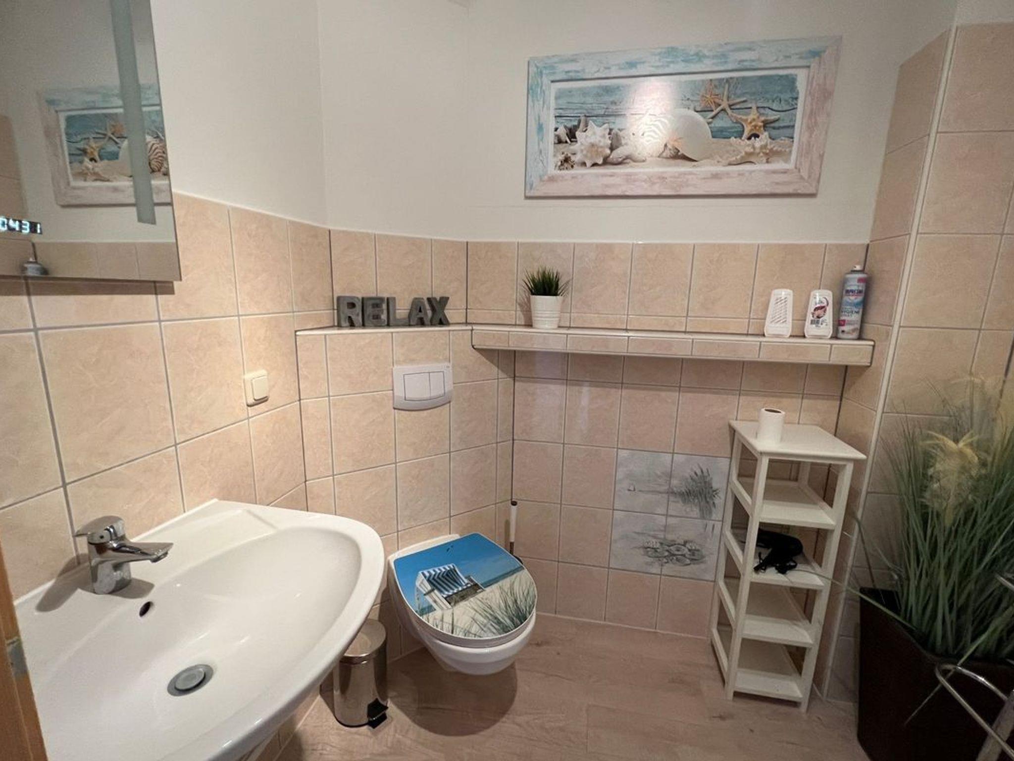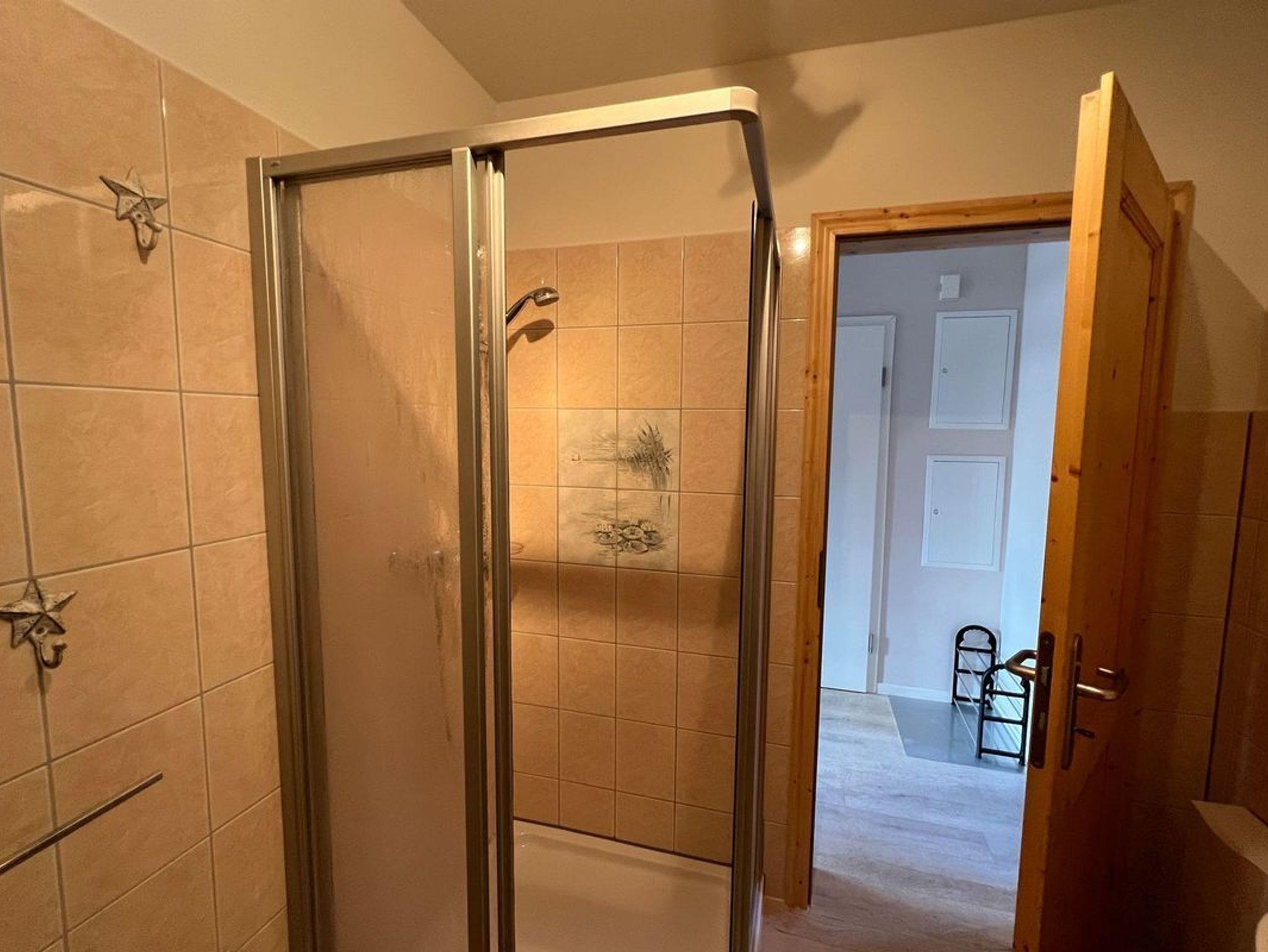 Das Badezimmer mit Dusche steht im unteren Teil der Wohnung für Sie bereit..