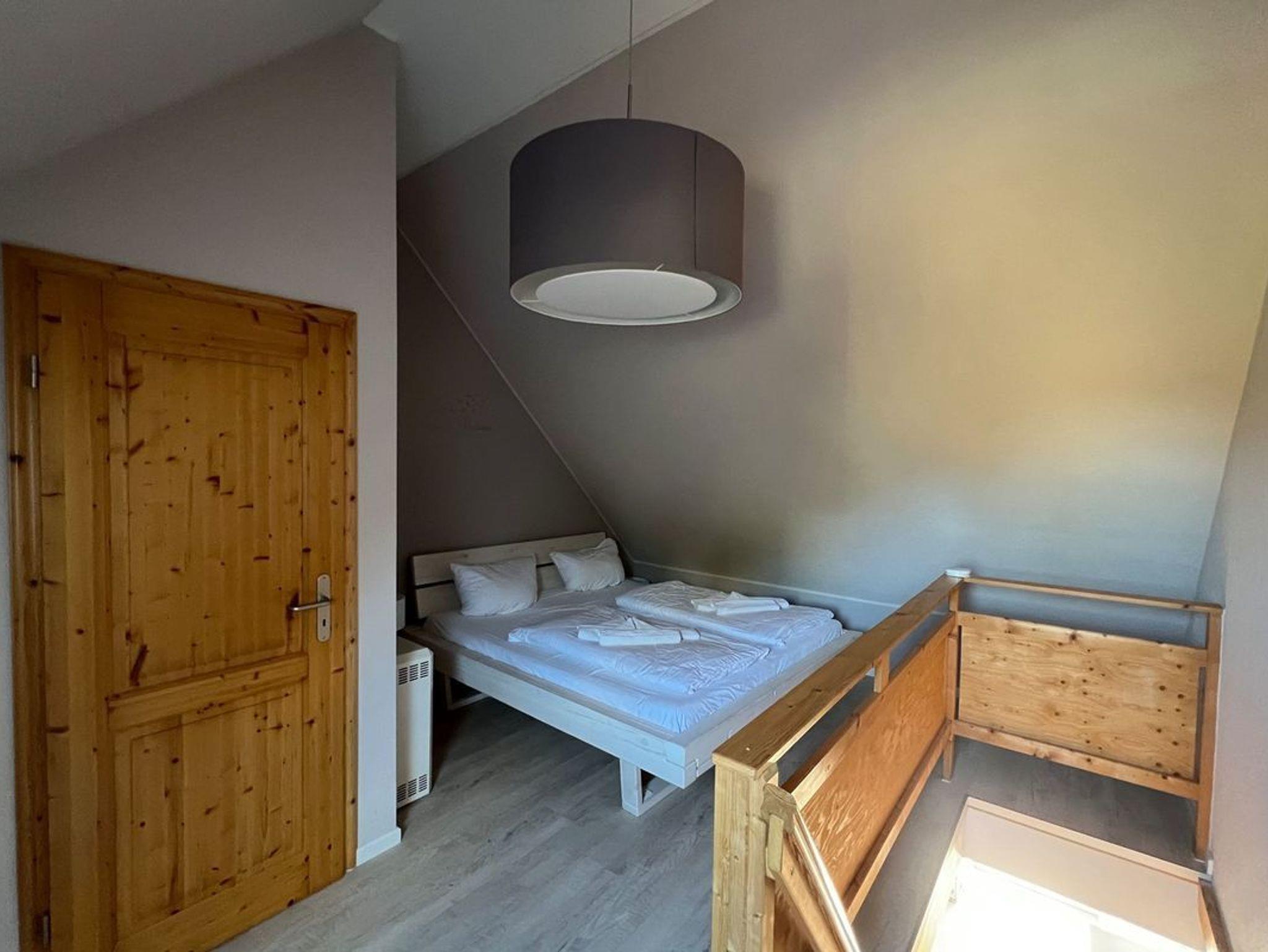 Das zweite Doppelbett befindet sich im offenen oberen Teil der Maisonettewohnung. Diesen Teil erreichen Sie über eine Treppe, die mit Schutzgitter für kleine Kinder ausgestattet ist. Des Weiteren finden Sie dort eine gemütliche Sitzecke, sowie ein Gästebad.