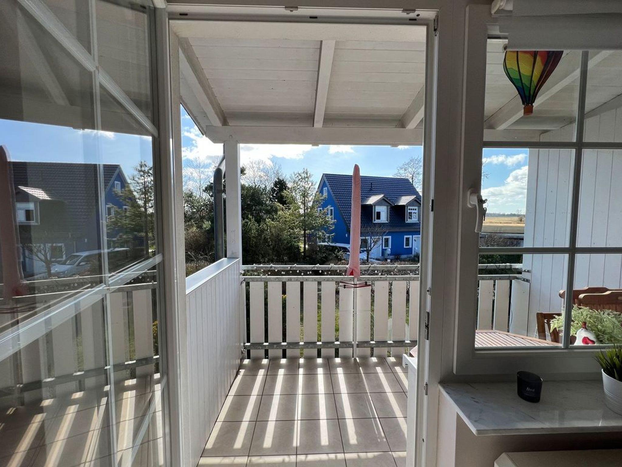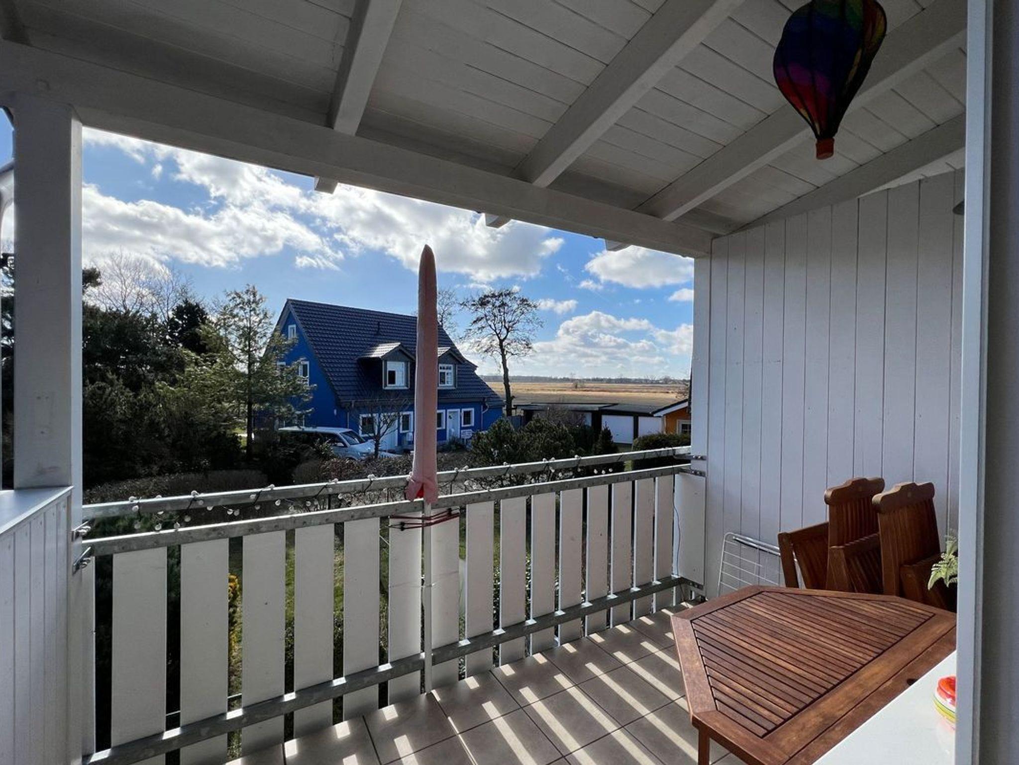 Vom Wohnnereich aus gelangen Sie auf den überdachten Balkon in Südlage, auf dem Sie den Urlaubstag in Ruhe und mit Blick in die Natur genießen können.