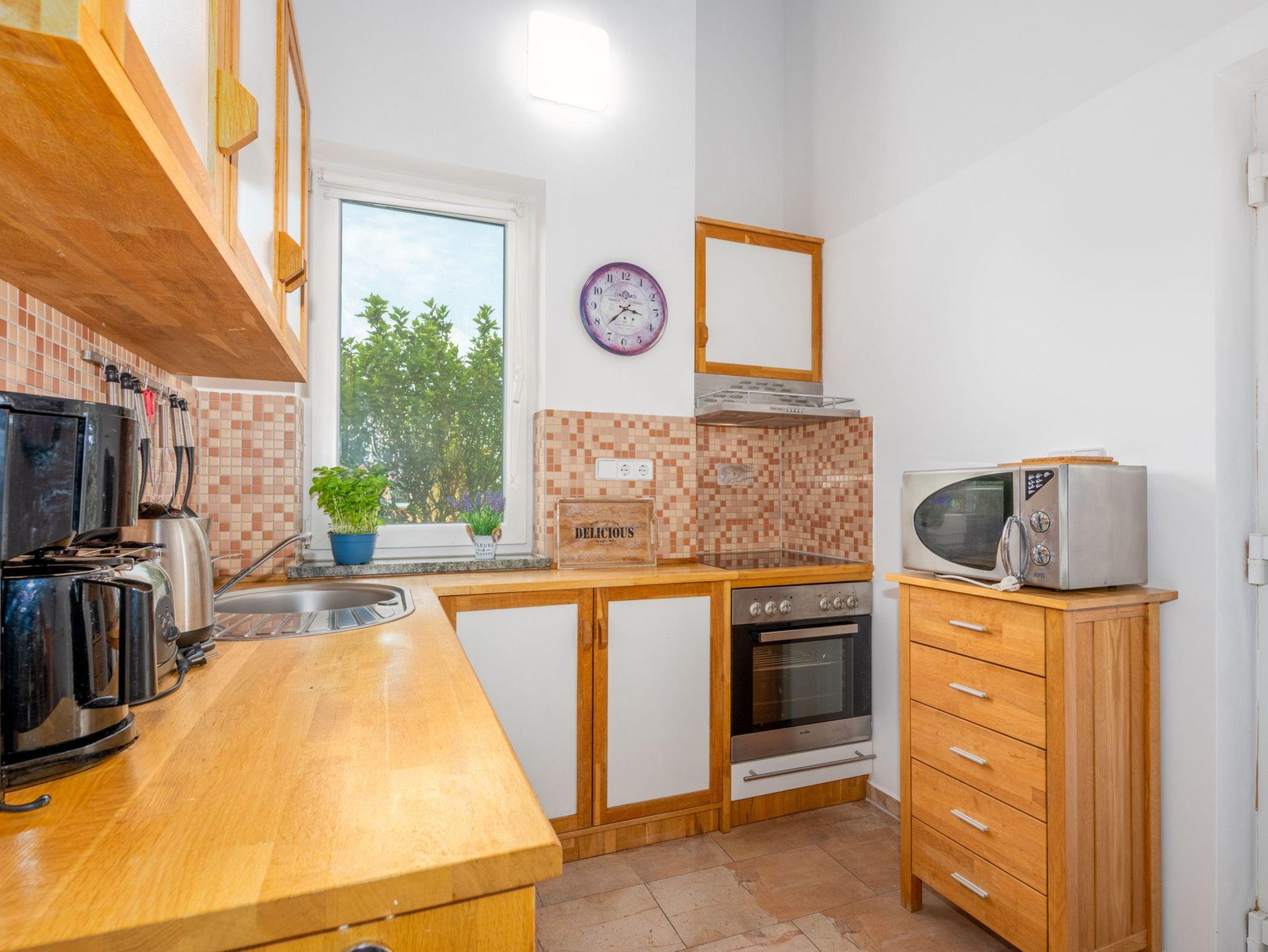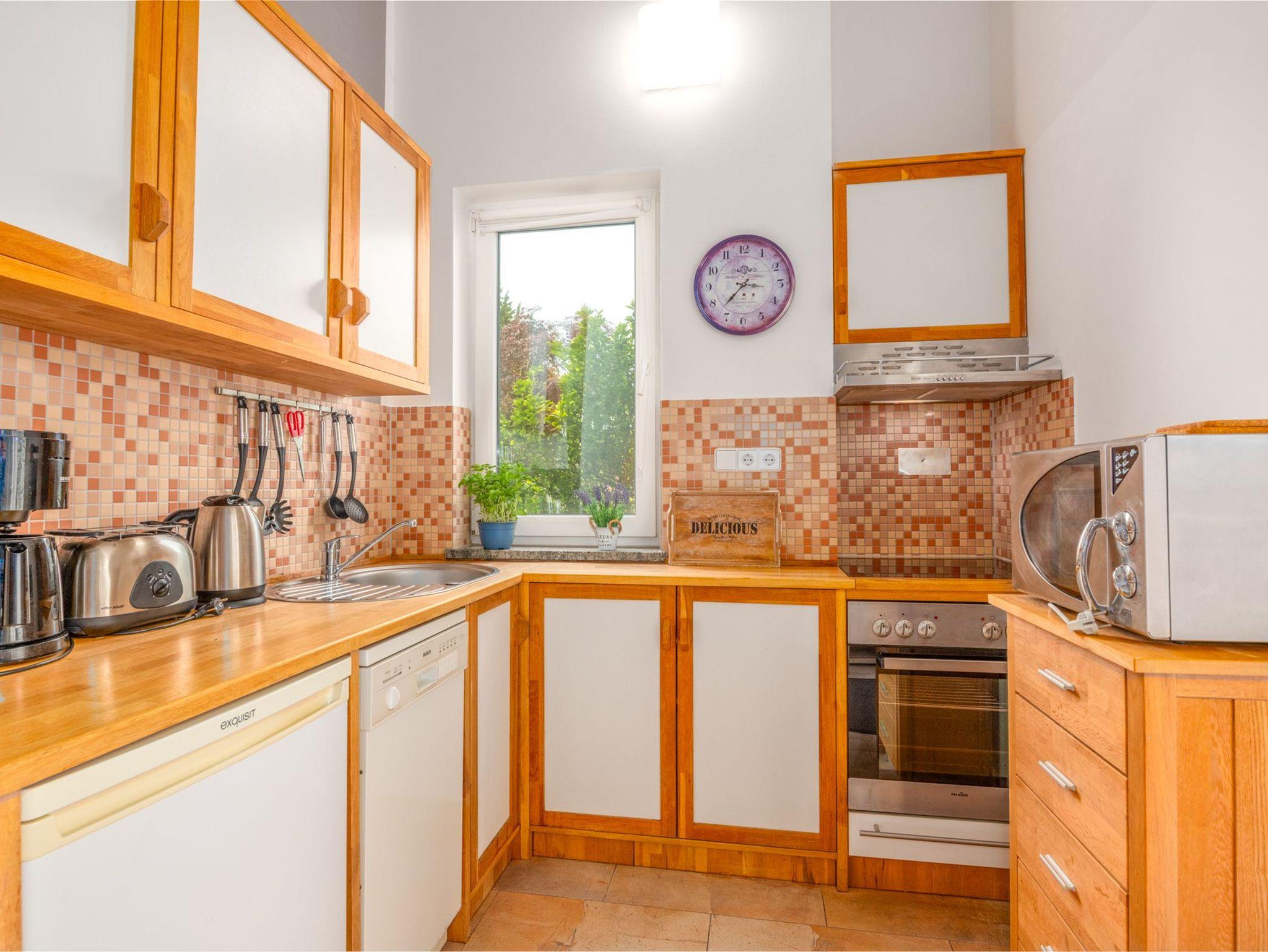 Die offene Küche ist vollständig ausgestattet mit Geschirrspüler, Backofen, Mikrowelle, Kühlschrank mit Gefrierfach, Kaffeemaschine und großem Esstisch.