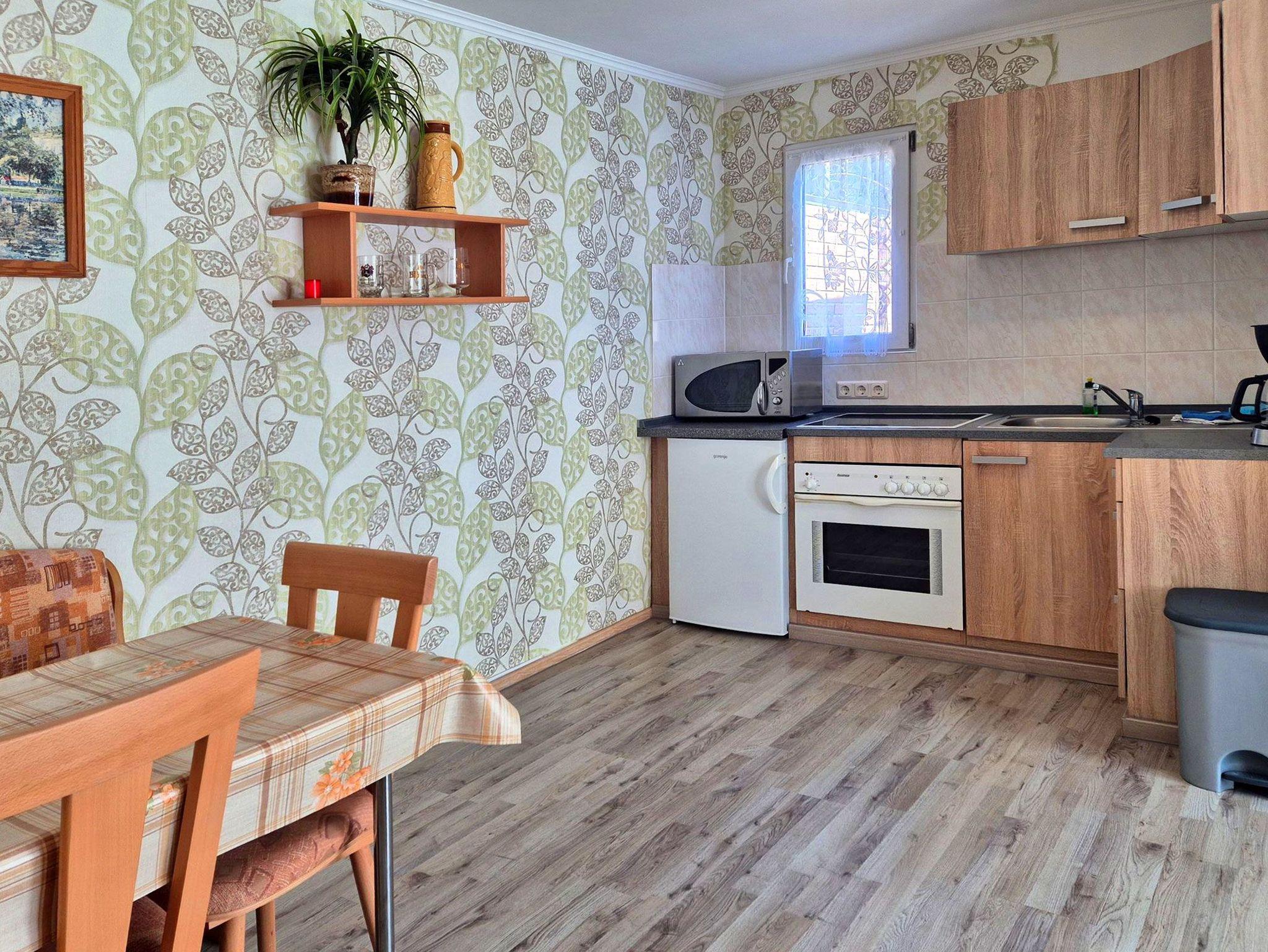 Küche mit 2 Plattenherd, Mikrowelle, Kühlschrank, Kaffeemaschine, Toaster,