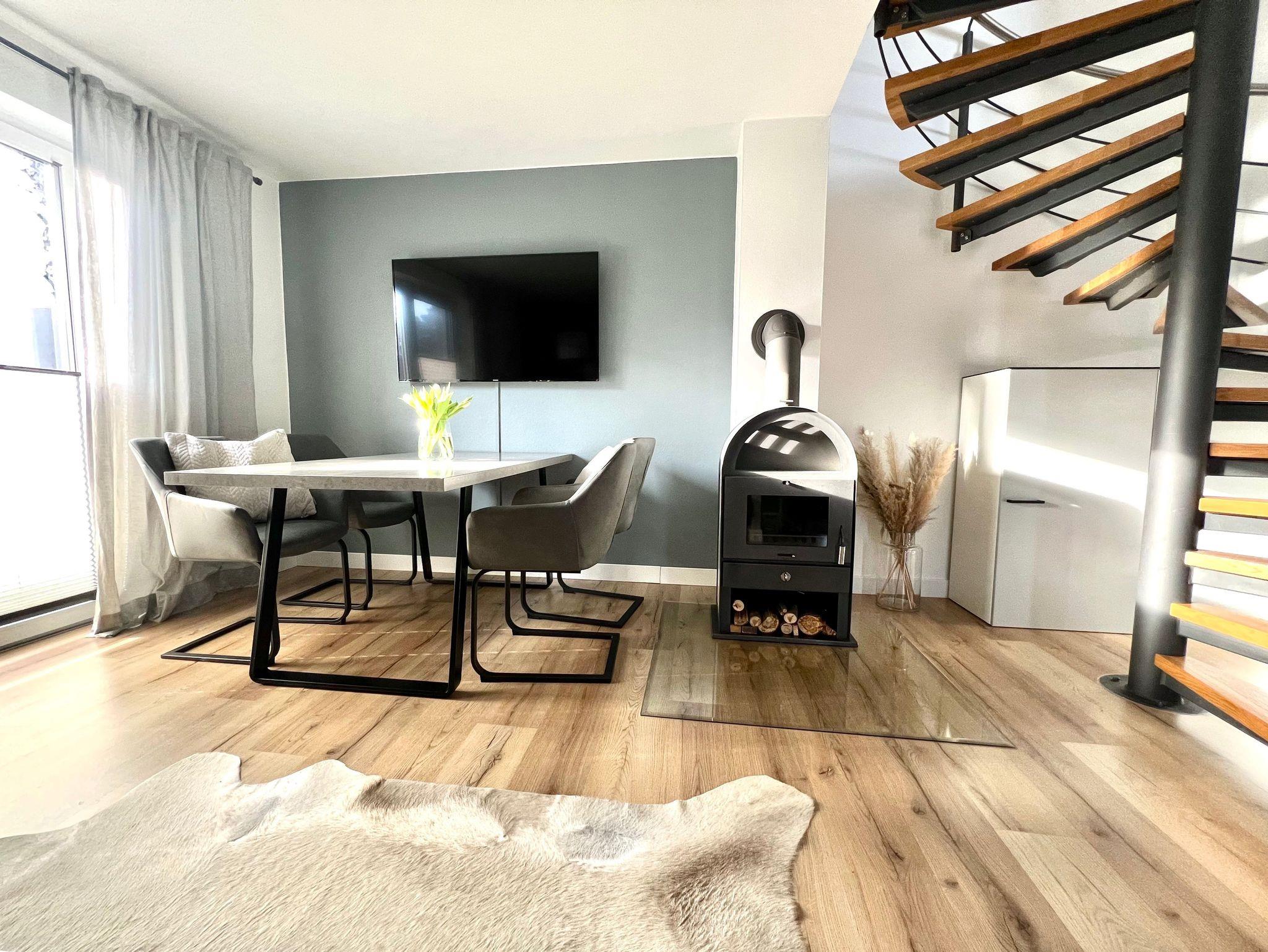 Der Wohnbereich ist mit einem gemütlichen Schlafsofa (Aufbettung 5. Person), Essbereich, Kamin und Smart- TV ausgestattet.
