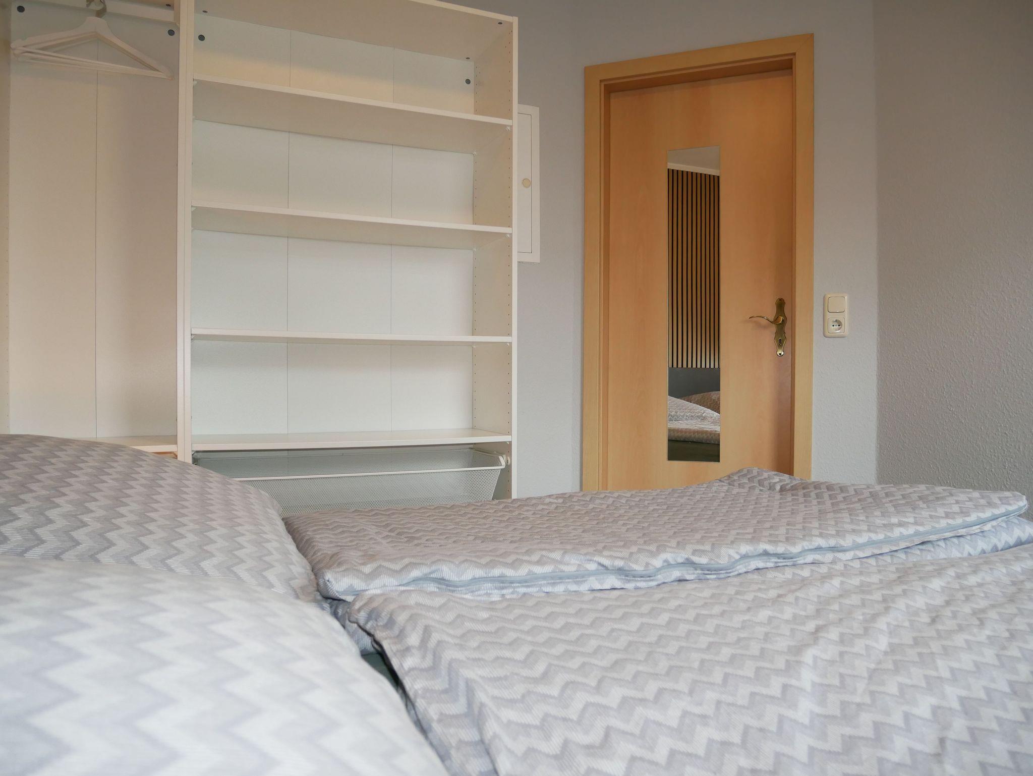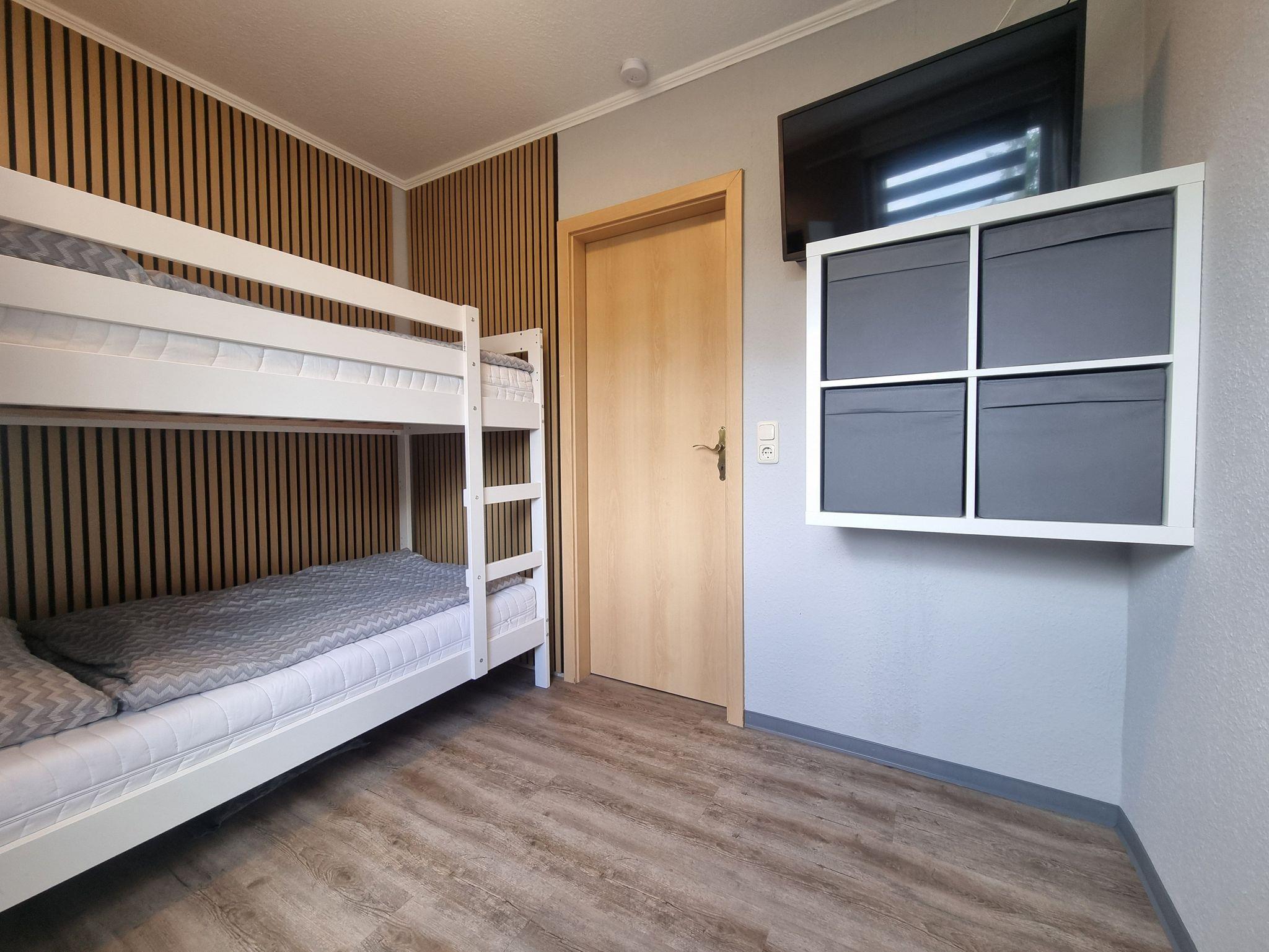 Die Ferienwohnung verfügt über 2 Schlafräume (1x Doppelbett, 1x 1 Etagenbett und zus. TV), einer voll ausgestatteten Küche mit Backofen, Kühlschrank mit Gefrierfach, Wasserkocher, Toaster und Kaffeemaschine. Der Wohn- und Essbereich verfügt über einen Flat-TV und einen Kamin für gemütliche Stunden. Das Badezimmer ist mit Dusche/WC, Waschmaschine und Fön ausgestattet. Die Fußböden sind teilweise mit Teppich im Wohn- und Schlafbereich, mit Linoleum im Küchen- und Essbereich und mit Fliesen im Bad ausgelegt. Die Wohnung hat eine separate Sitzmöglichkeit im Außenbereich. Ein PKW-Stellplatz und WLAN stehen Ihnen kostenfrei zur Verfügung.