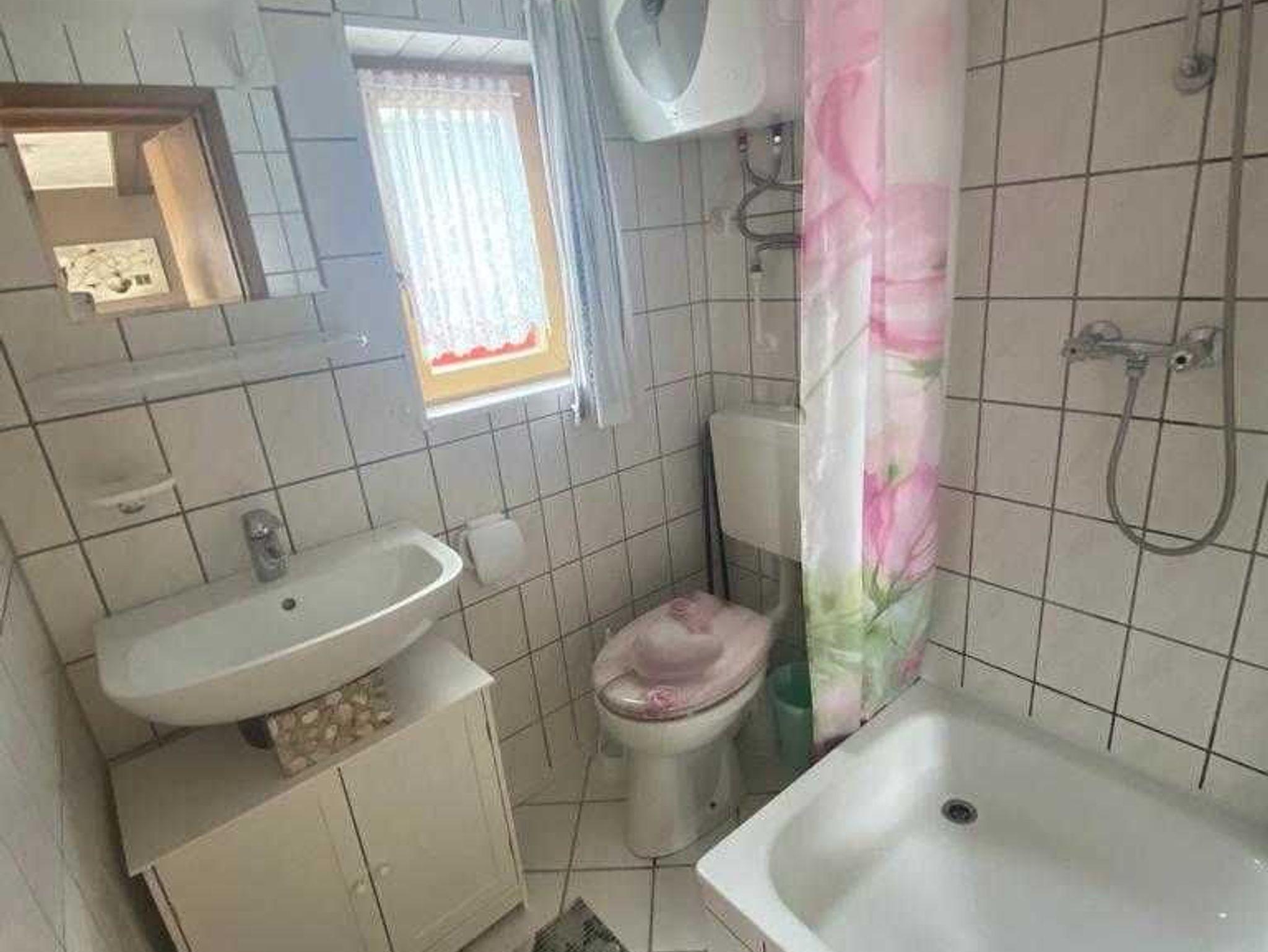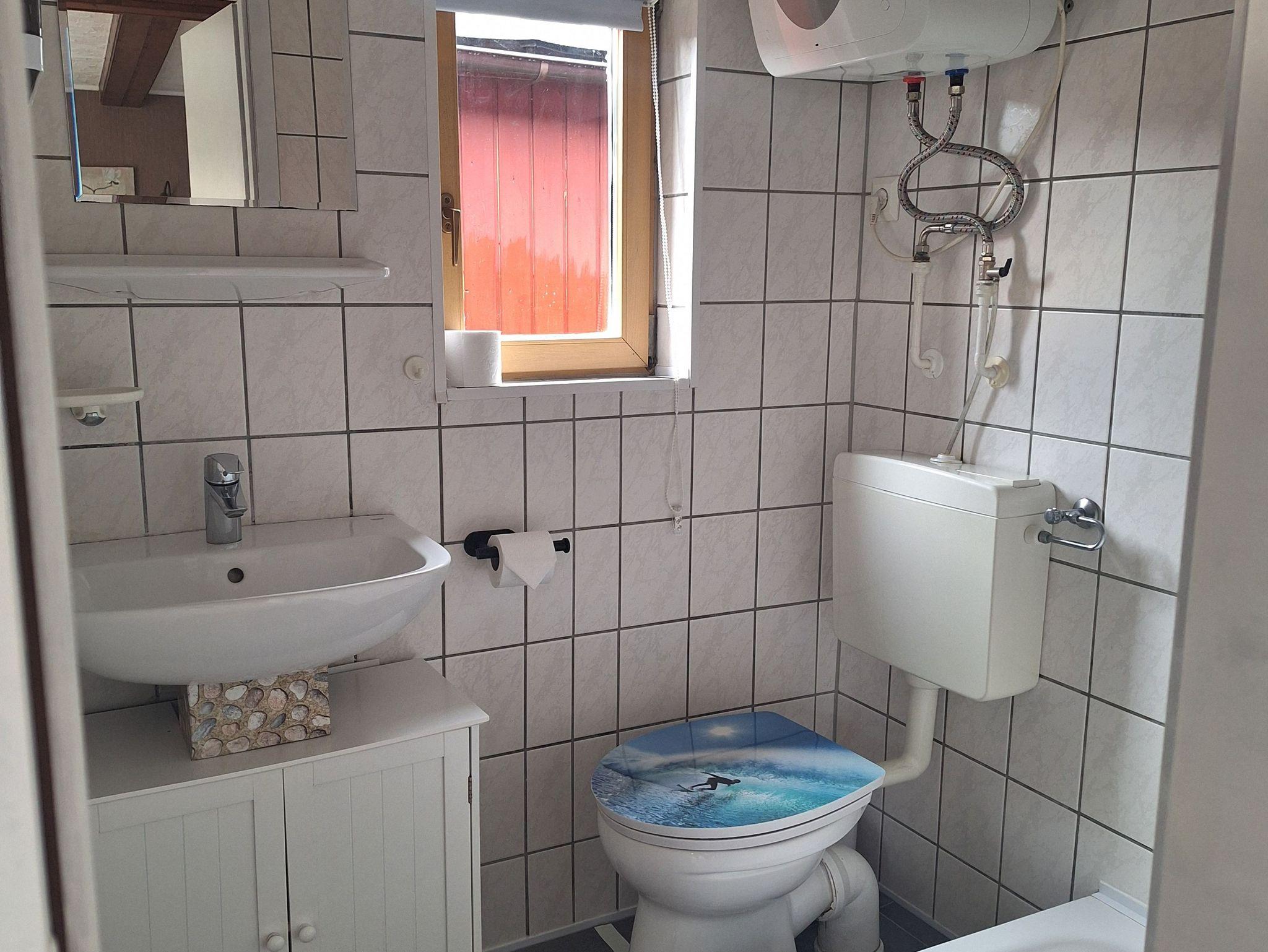 Das Bad ist ausgestattet mit WC und Dusche.
