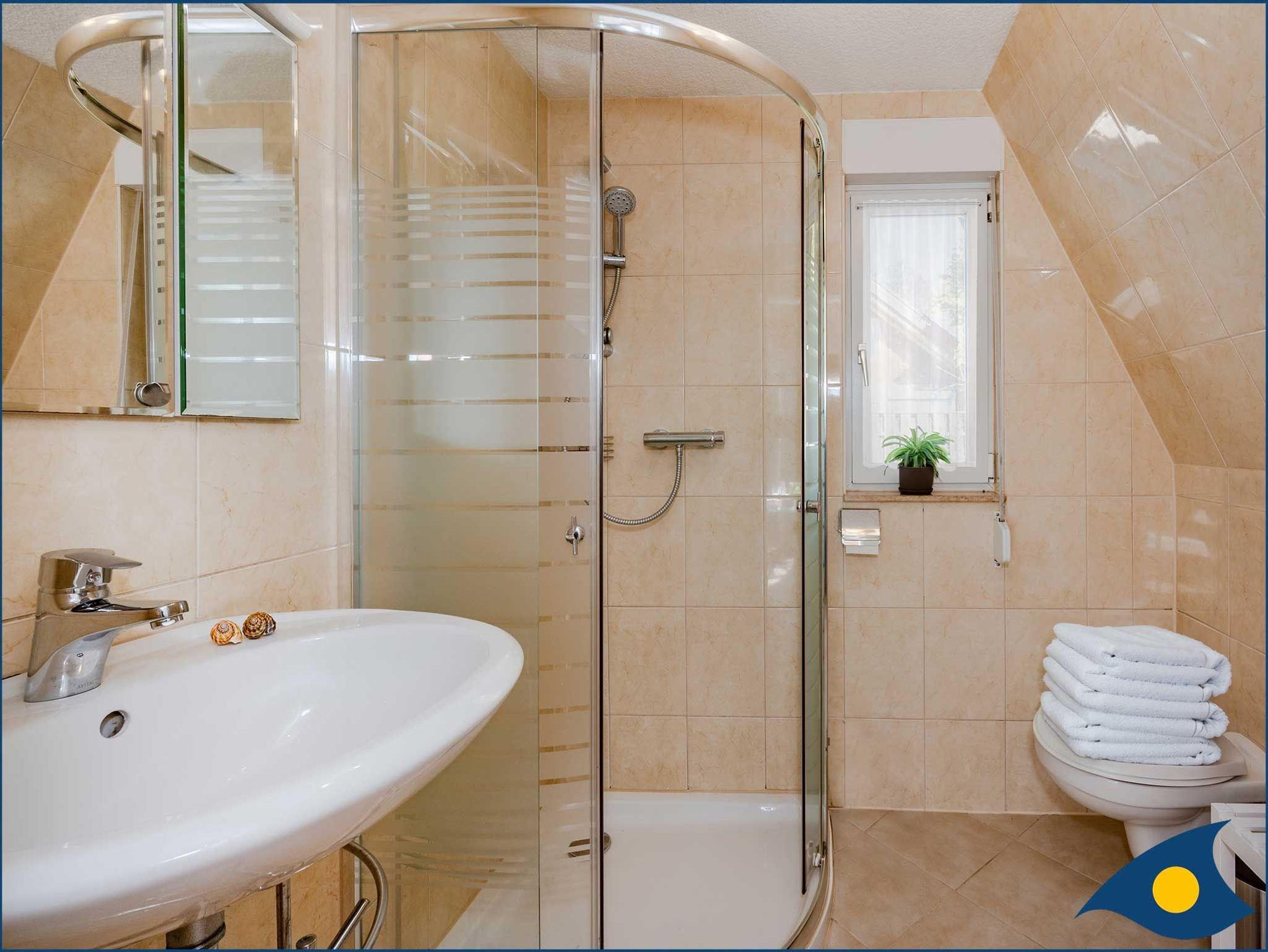 Die moderne separate Küche mit Ceranherd, Geschirrspüler, Kühl- und Gefrierschrank, Mikrowelle, Kaffeemaschine, Toaster, Wasserkocher, Dunstabzugshaube und das Badezimmer mit Dusche, Waschbecken und WC tragen ebenfalls zum Wohlfühlen bei.
