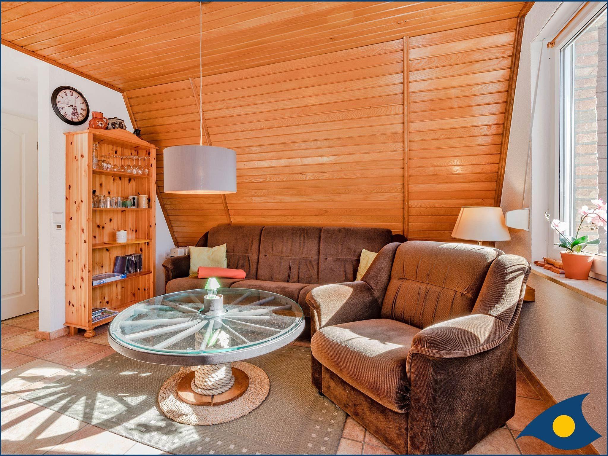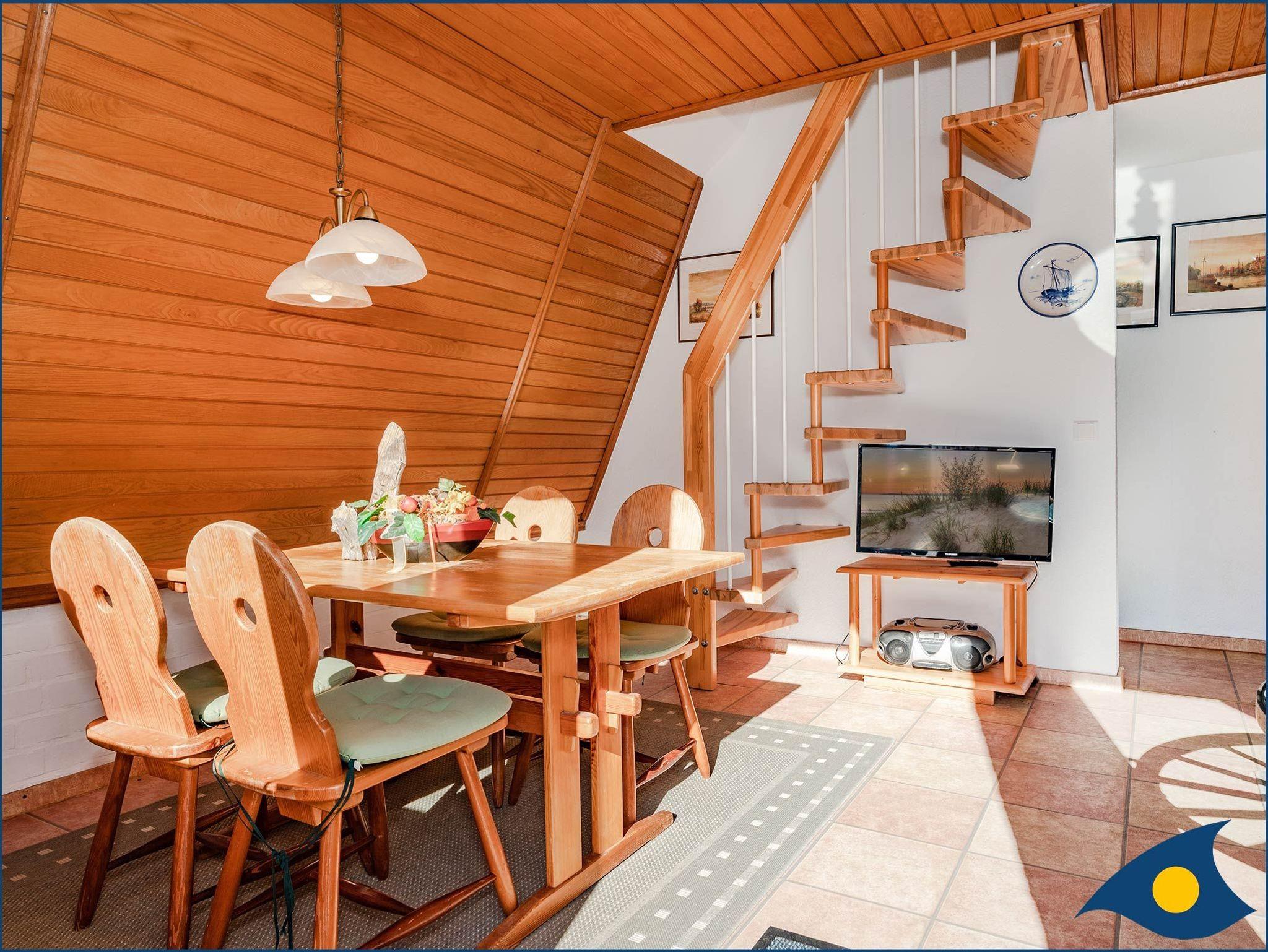 Das große Wohnzimmer im Erdgeschoss mit Ess- und Sitzecke, SAT-TV, DVD-Player, Radio mit CD und einer Garderobe mit Safe ist der Mittelpunkt des Appartements. Eine neu installierte Fußbodenheizung sorgt für wohlige Wärme auch an kühleren Tagen.