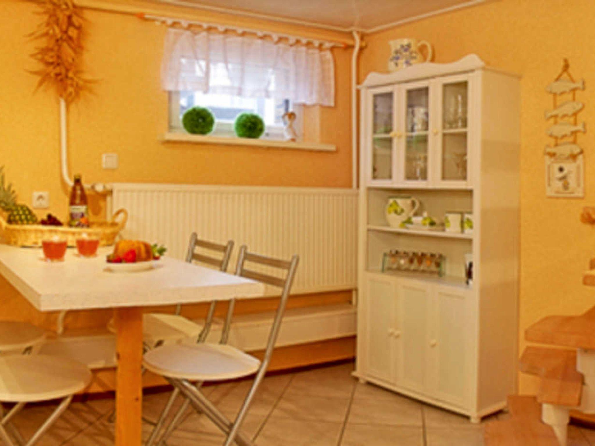 In der komplett eingerichteten Küche mit Geschirrspüler kann bequem am Tisch mit vier Stühlen gespeist werden.