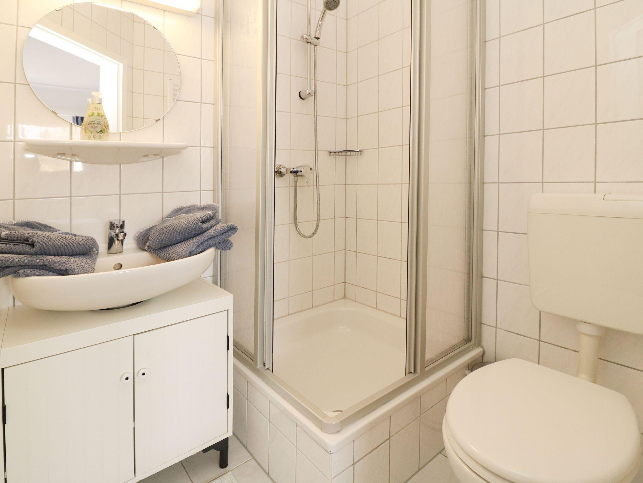 Das Bad befindet sich separat und beinhaltet Dusche und WC.