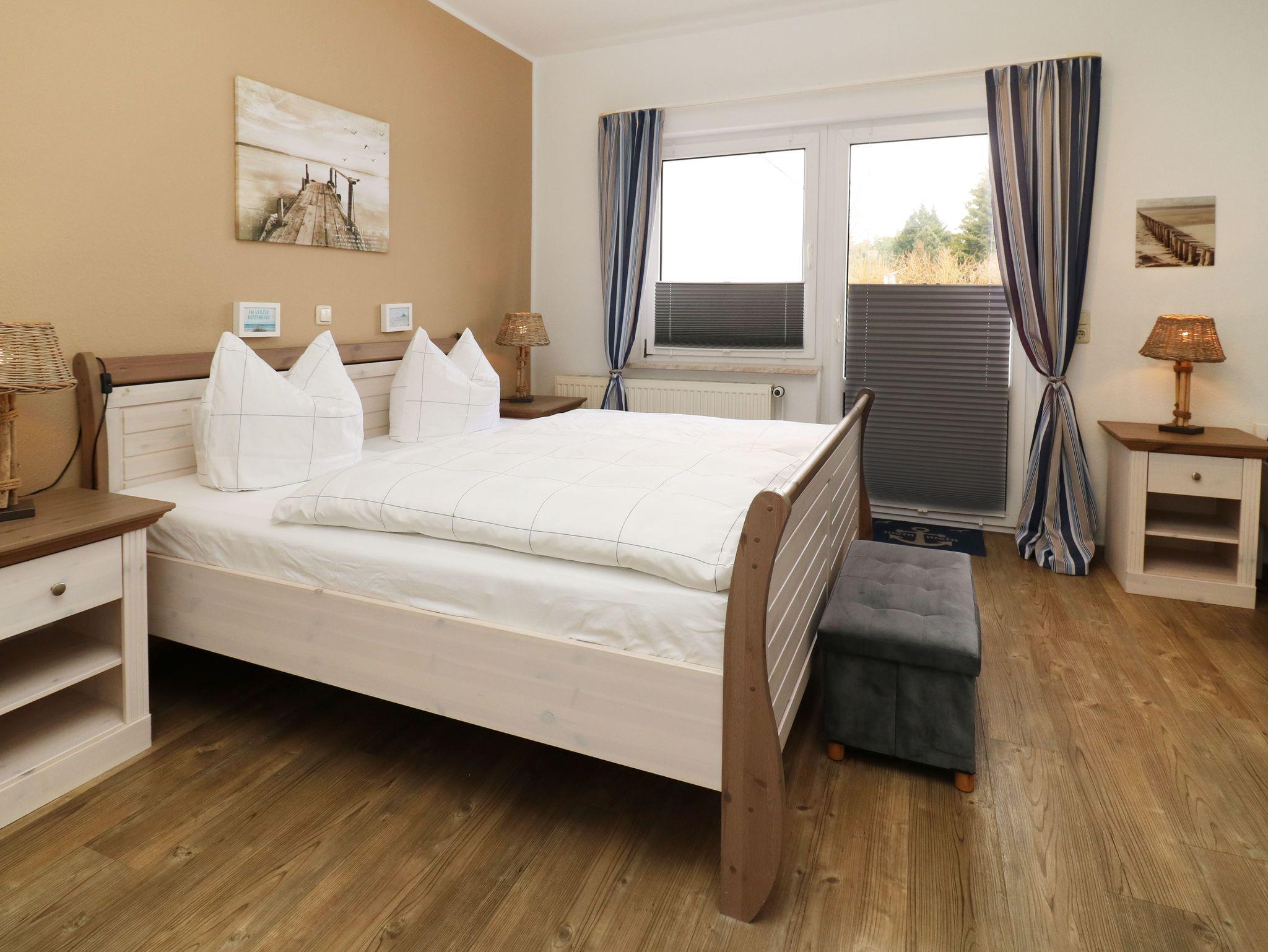 Das maritim eingerichtete Schlafzimmer verfügt über ein Doppelbett (180x200cm) sowie über ein Einzelbett (90x200cm) -