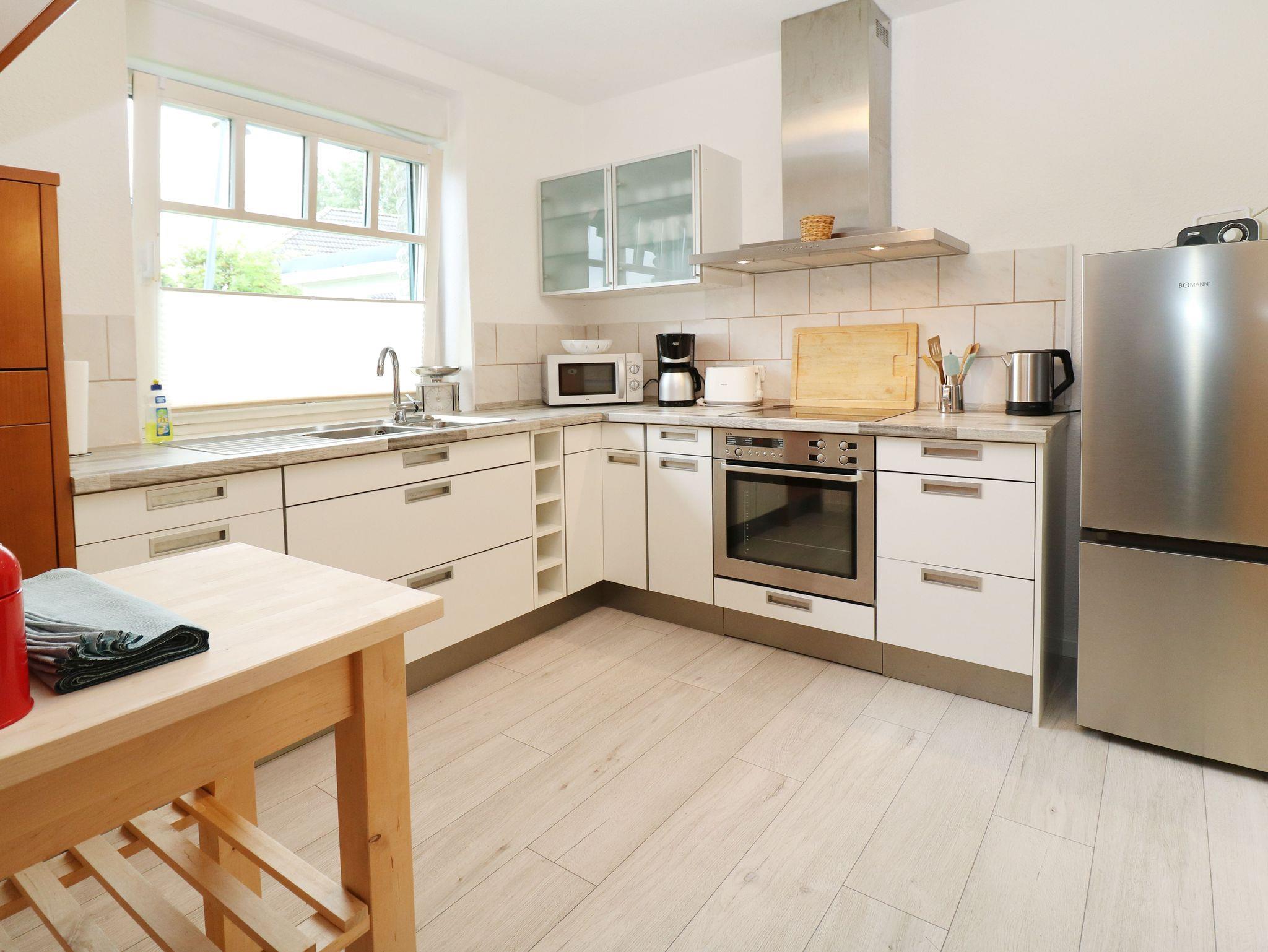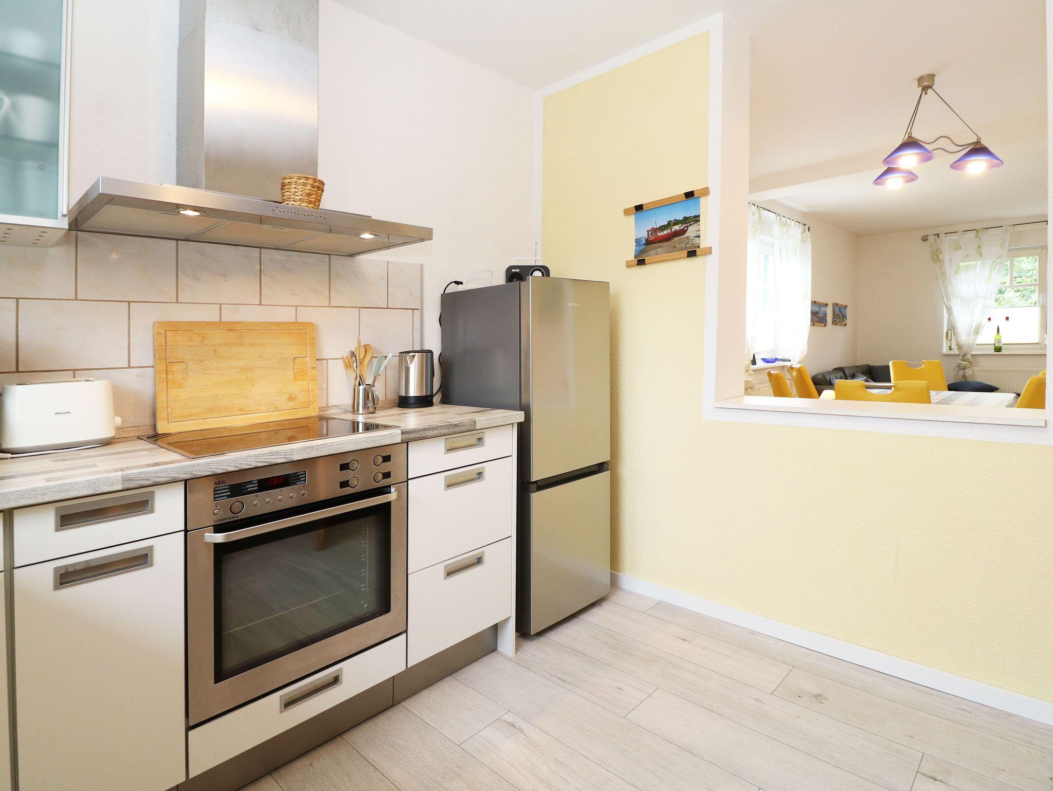 Die komplett ausgestattete Küche ist über eine Durchreiche mit dem Wohnzimmer verbunden, so dass alle Speisen und Getränke direkt an den Esstisch gereicht werden können.