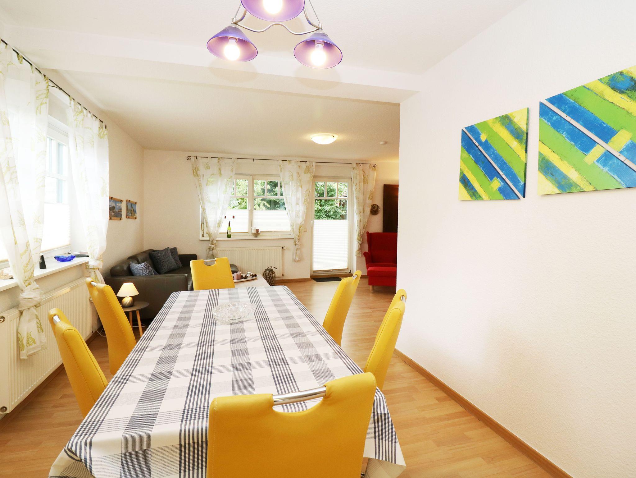 Das Wohnzimmer verfügt über eine Couchgarnitur mit Tisch und einem Essbereich für 6 Personen.