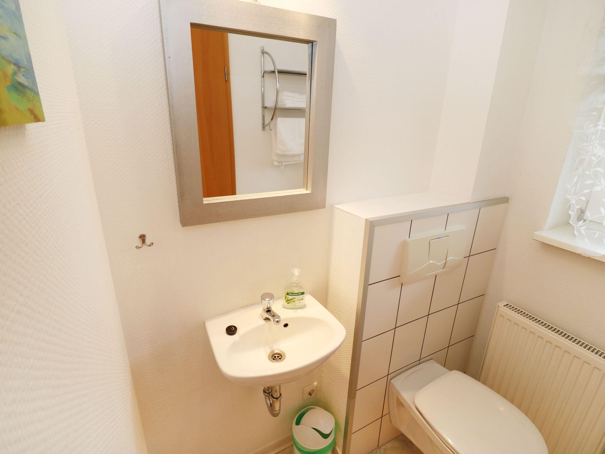 Im Erdgeschoss befindet sich ein Gäste-WC mit Fenster. Das Bad mit Badewanne und Dusche ist im Obergeschoss untergebracht.