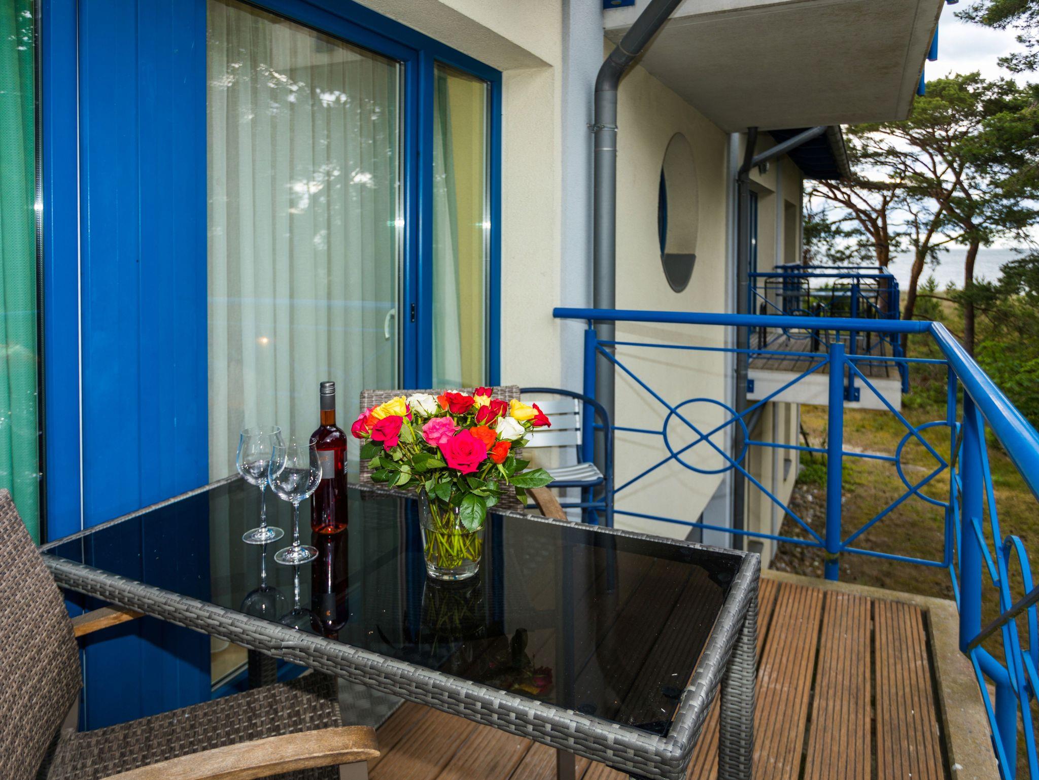 • Wohnfläche ca. 75 m², Balkon mit seitlichem Meerblick und Sitzmöbeln