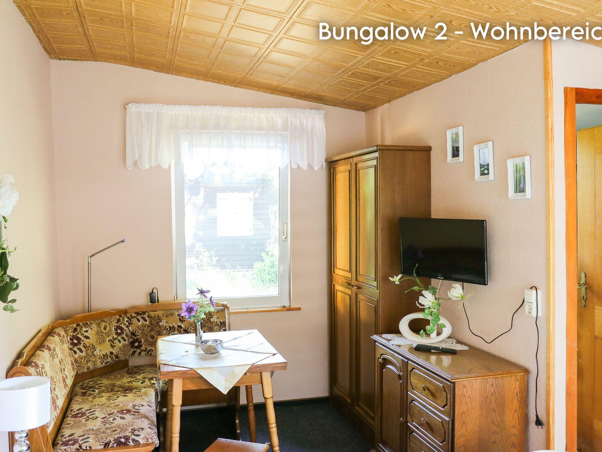 Der gemütliche Bungalow für 2 Personen verfügt über einen kombinierten Wohnschlafbereich mit Doppelbett, Esstisch, Flat-TV und einer offenen Küchenzeile mit 2-Plattenherd, Kühlschrank mit Gefrierfach, Kaffeemaschine und Wasserkocher. Vor dem Bungalow befindet sich eine möblierte Terrasse. WLAN steht Ihnen kostenfrei zur Verfügung. Die Bettwäsche ist inklusive, Handtücher bringen Sie bitte selbst mit.
