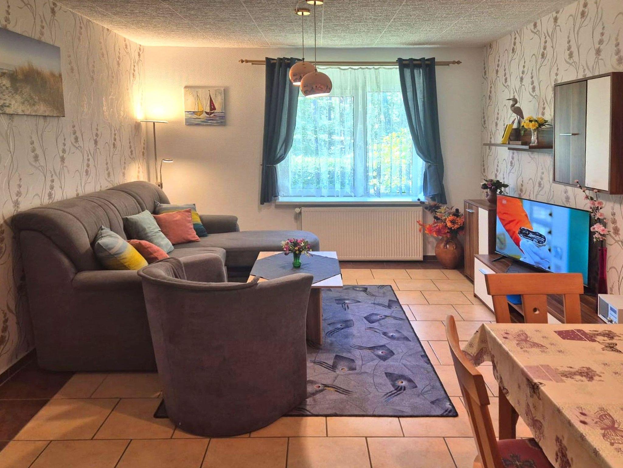 Wohnzimmer mit Saidbord, Couch und Sessel, Radio, Flach- TV, Esstisch