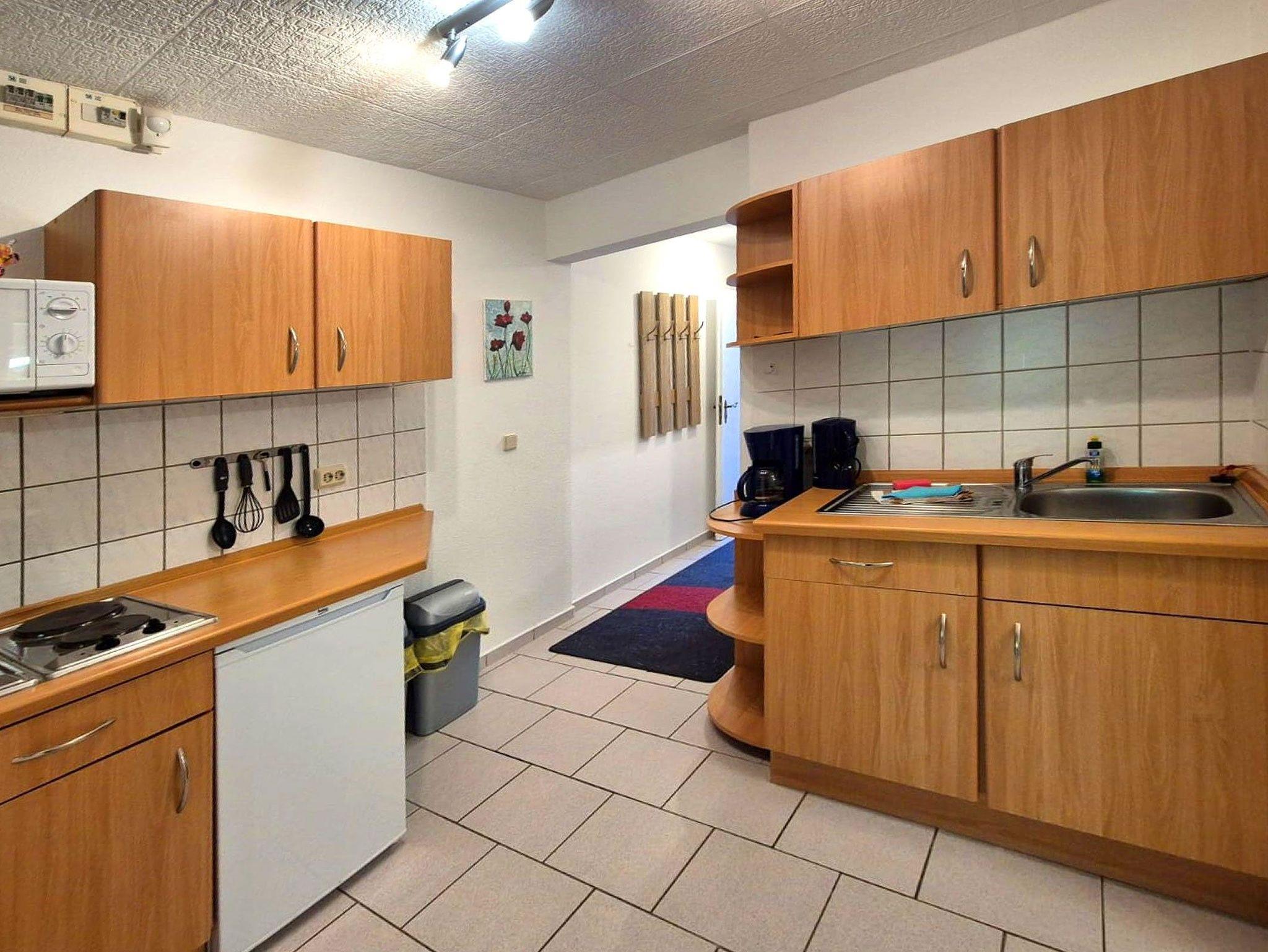 Küche mit 2 Plattenherd, Mikrowelle, Kühlschrank, Kaffeemaschine, Toaster,