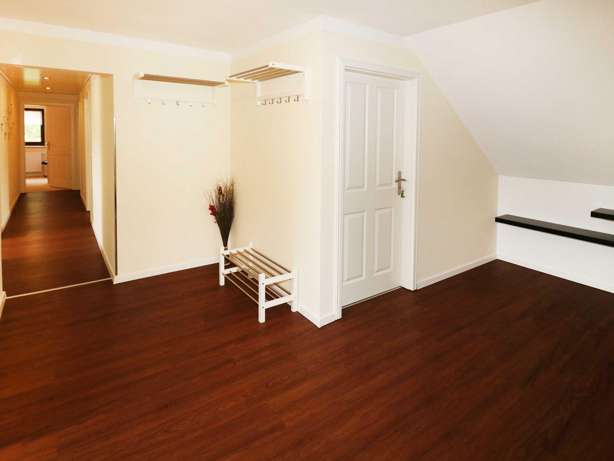 Über eine Treppe gelangt man direkt in den Eingangsbereich mit Schuhregal und mehreren Kleiderhaken und über den Flur in alle angrenzenden Räume.