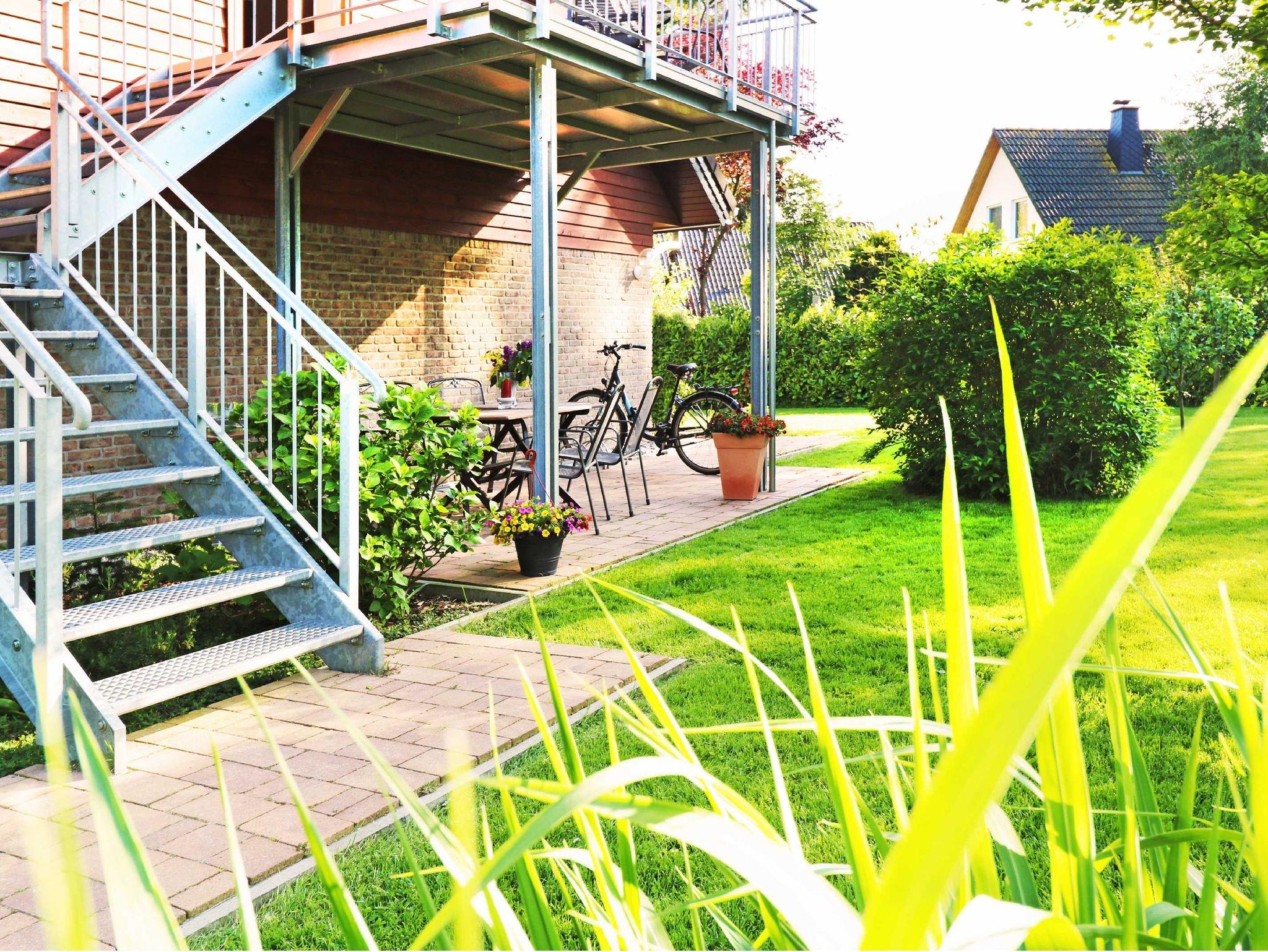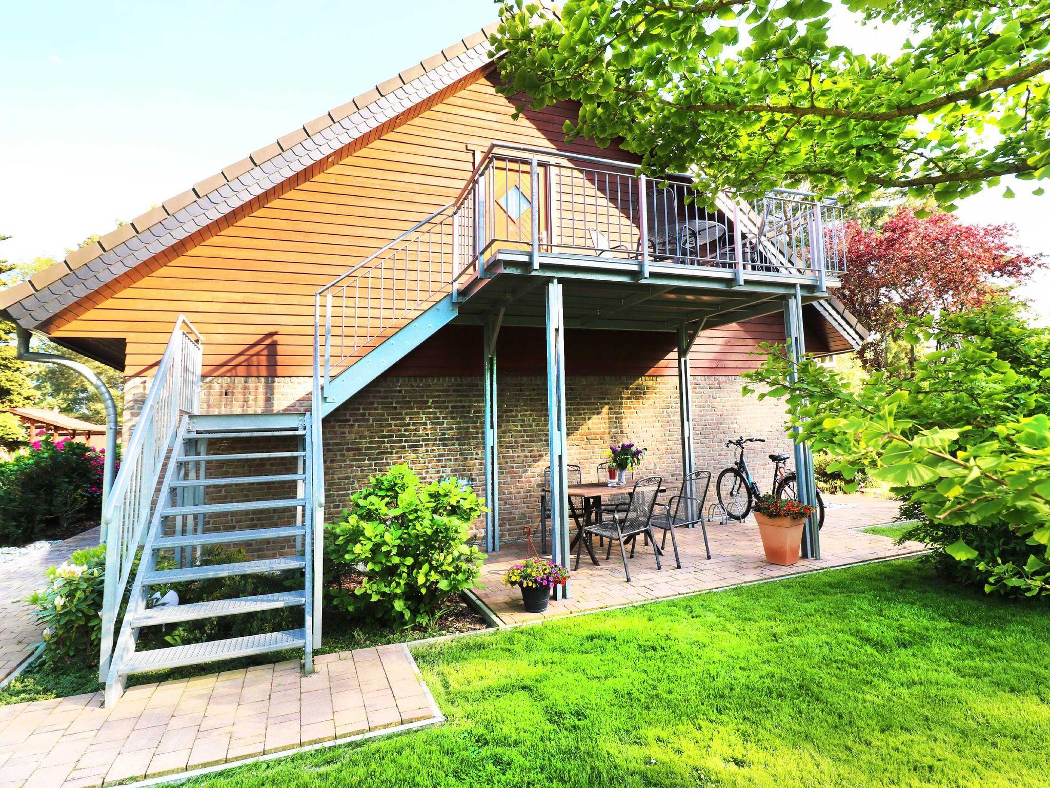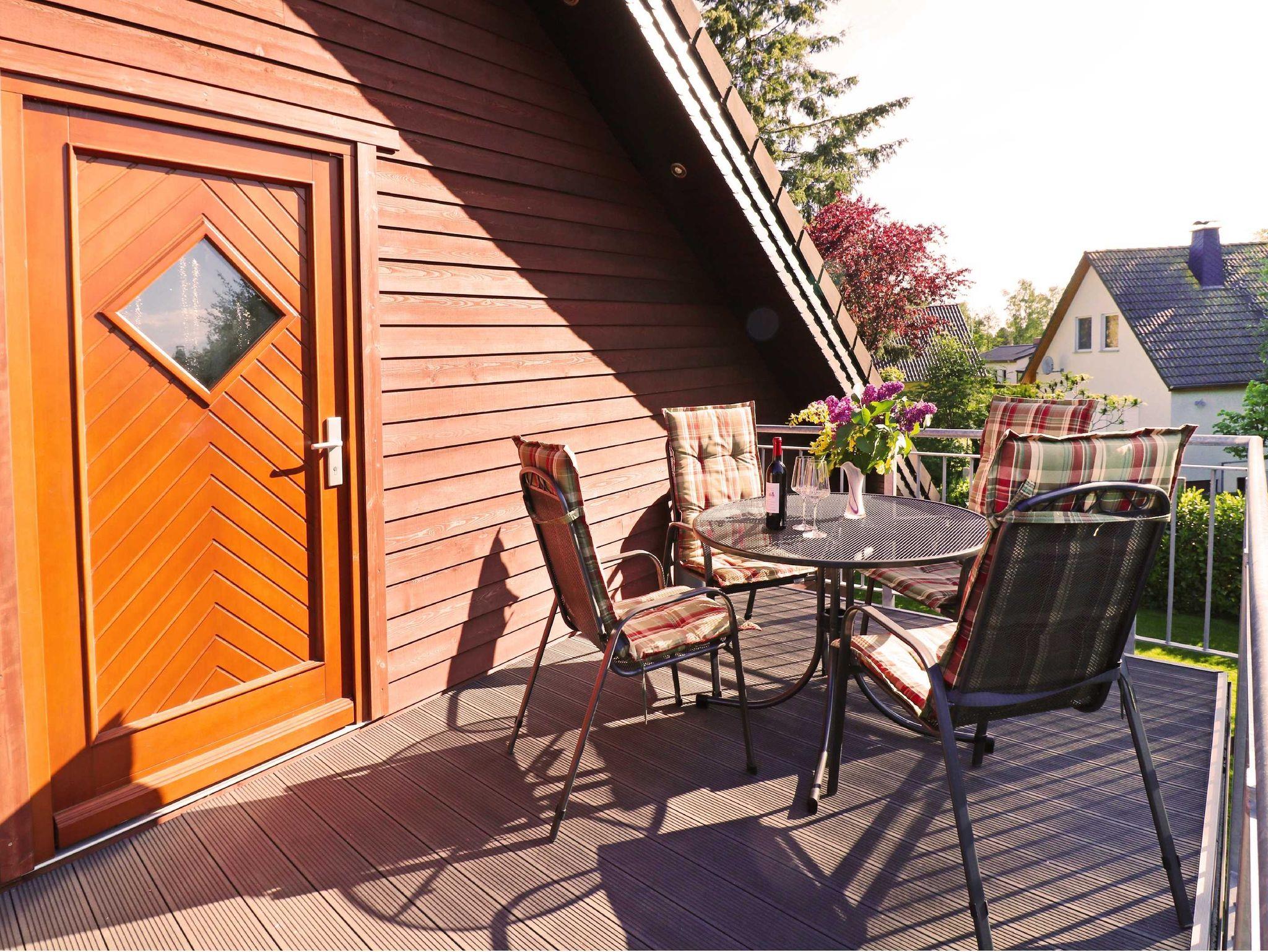 Die Dachgeschossferienwohnung verfügt über einen separaten Eingang und einen Balkon mit Blick auf den grünen Garten und das gegenüberliegende Ferienhaus. Auf dem Balkon befindet sich ein großzügiger Esstisch und mehrere Sitzgelegenheiten.