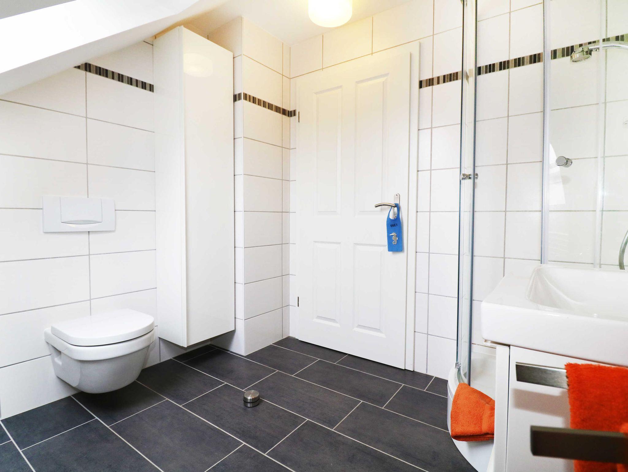 Über den Flur gelangt man in das großzügige Badezimmer mit Waschbecken und WC sowie einer Dusche mit niedrigem Einstieg.