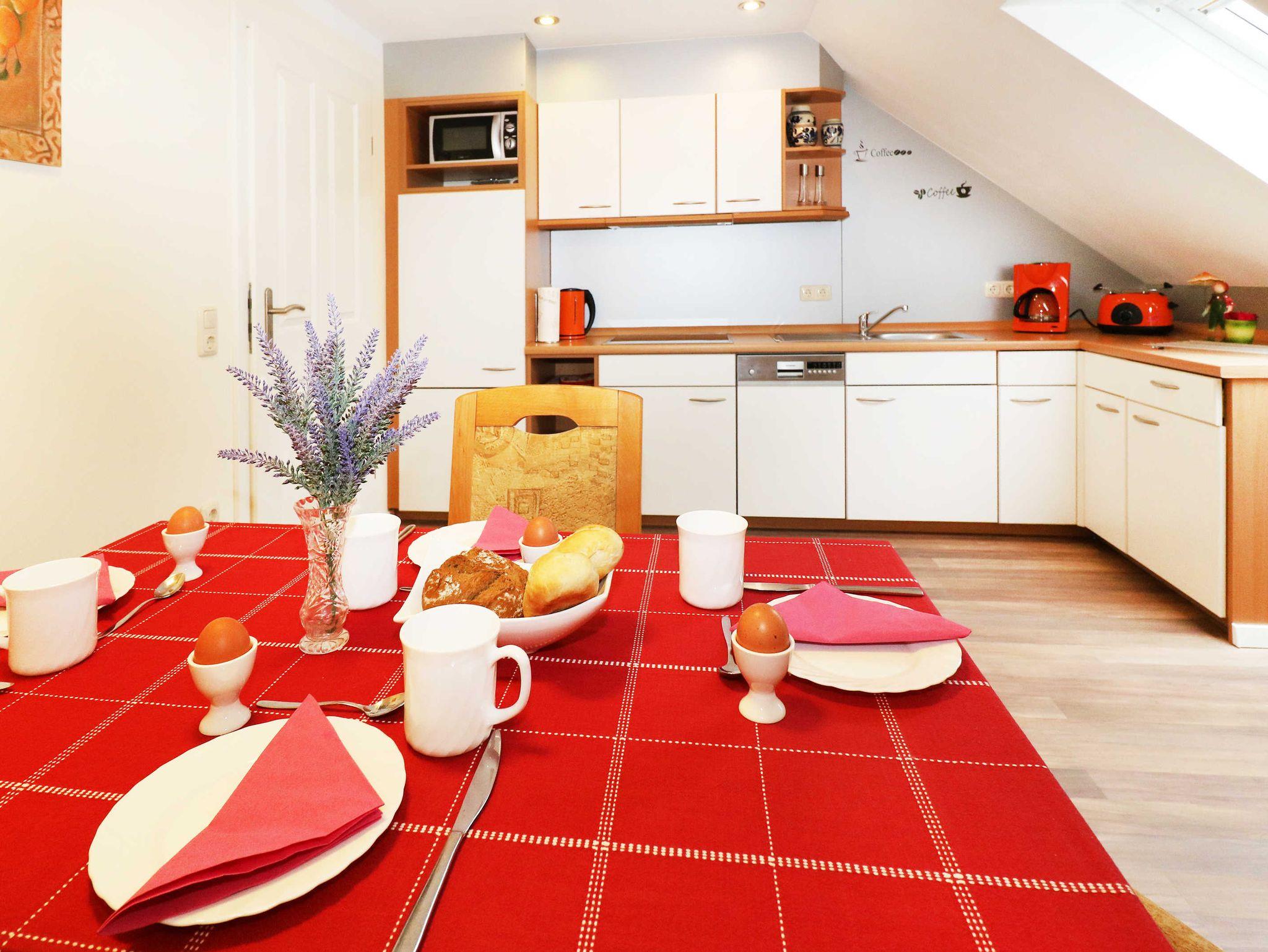Die Küche verfügt über eine komplett eingerichtete Kochecke mit einem Cerankochfeld mit 4-Kochstellen, Geschirrspüler, Mikrowelle; Kühlschrank mit einer Gefriermöglichkeit sowie Kaffeemaschine; Wasserkocher und Toaster. In der Küche befindet sich der Essbereich mit ausreichend Sitzmöglichkeiten für 4 Personen.