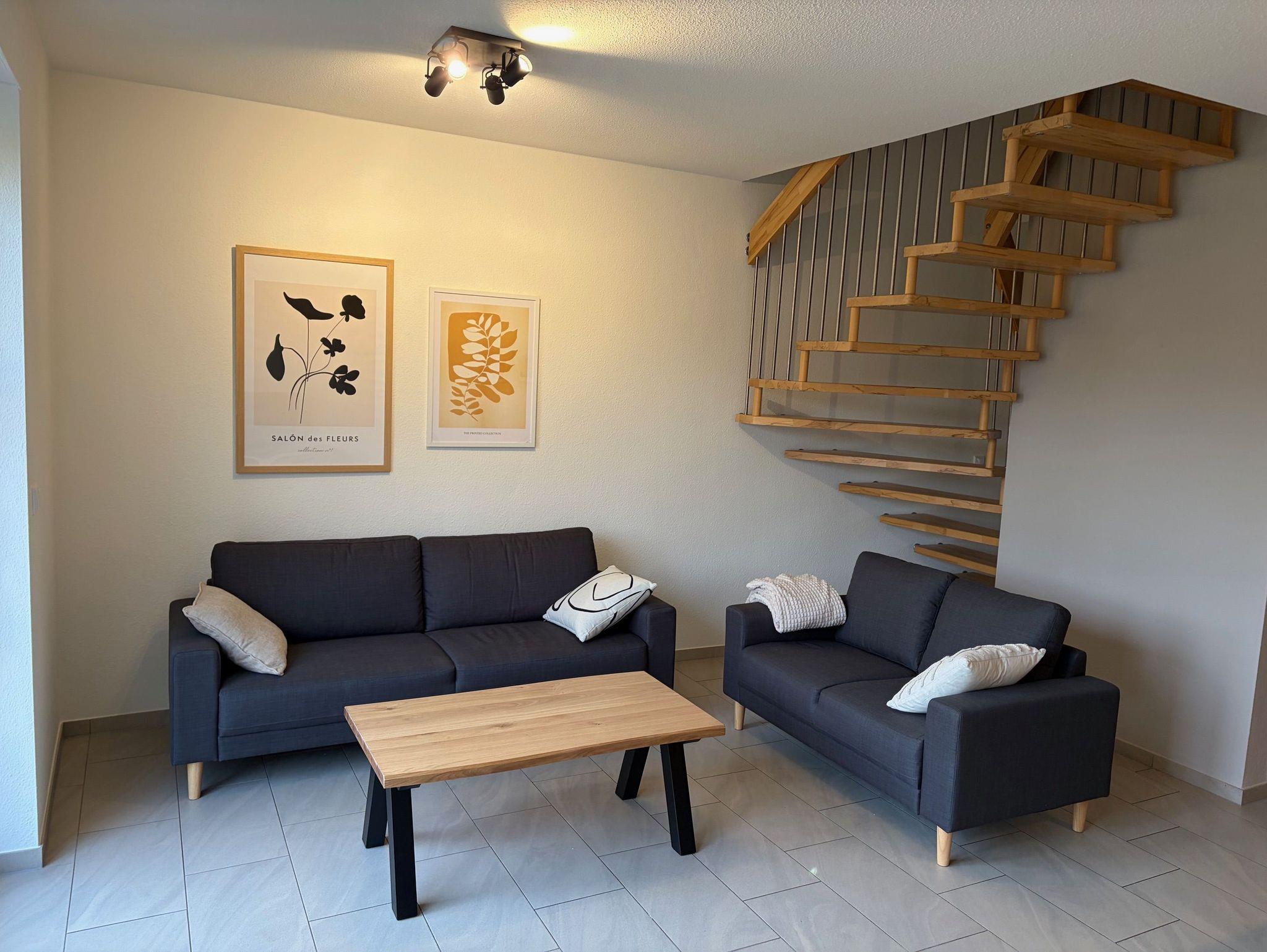 Die beiden Schlafzimmer, sowie ein WC, befinden sich im Obergeschoss. Im Erdgeschoss befindet sich das Wohnzimmer mit integrierter Küche und Essbereich, sowie ein Badezimmer mit Dusche.