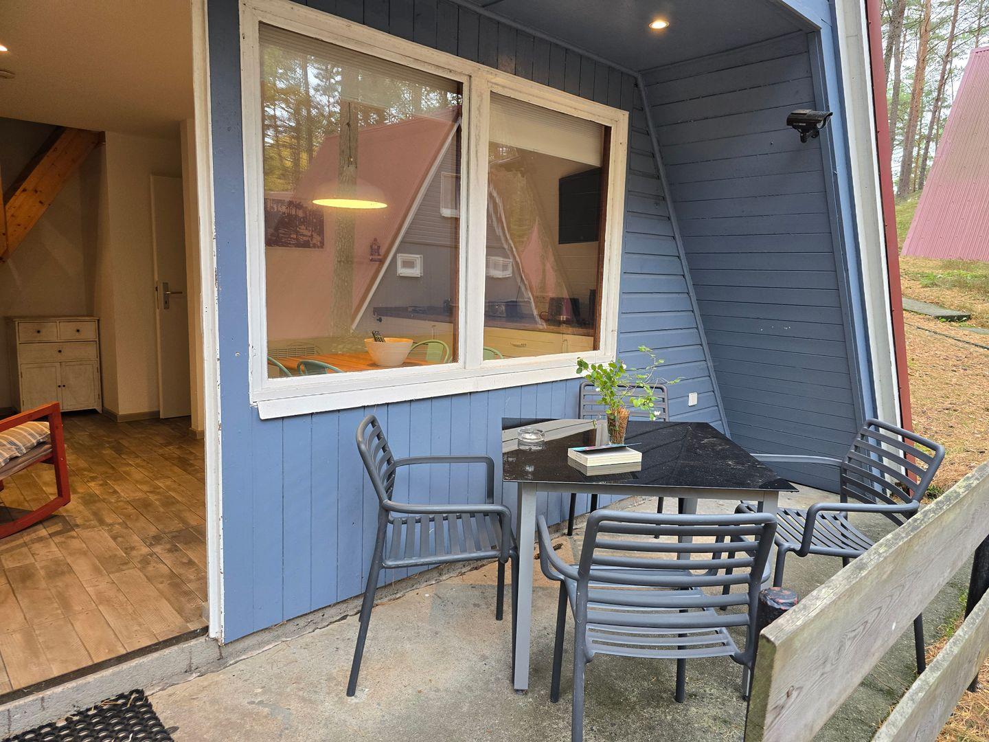 Vor der Hütte liegt die Terrasse. Ein Tisch, Stühle, etwas Wiese, drumherum Kiefern. Hier schmeckt der Morgenkaffee nach Salz und Sonne. Wer möchte, bringt den Hund mit – ein Hund pro Hütte ist willkommen. Bettwäsche und Handtücher können Sie gern selbst mitbringen oder unkompliziert bei uns mieten.