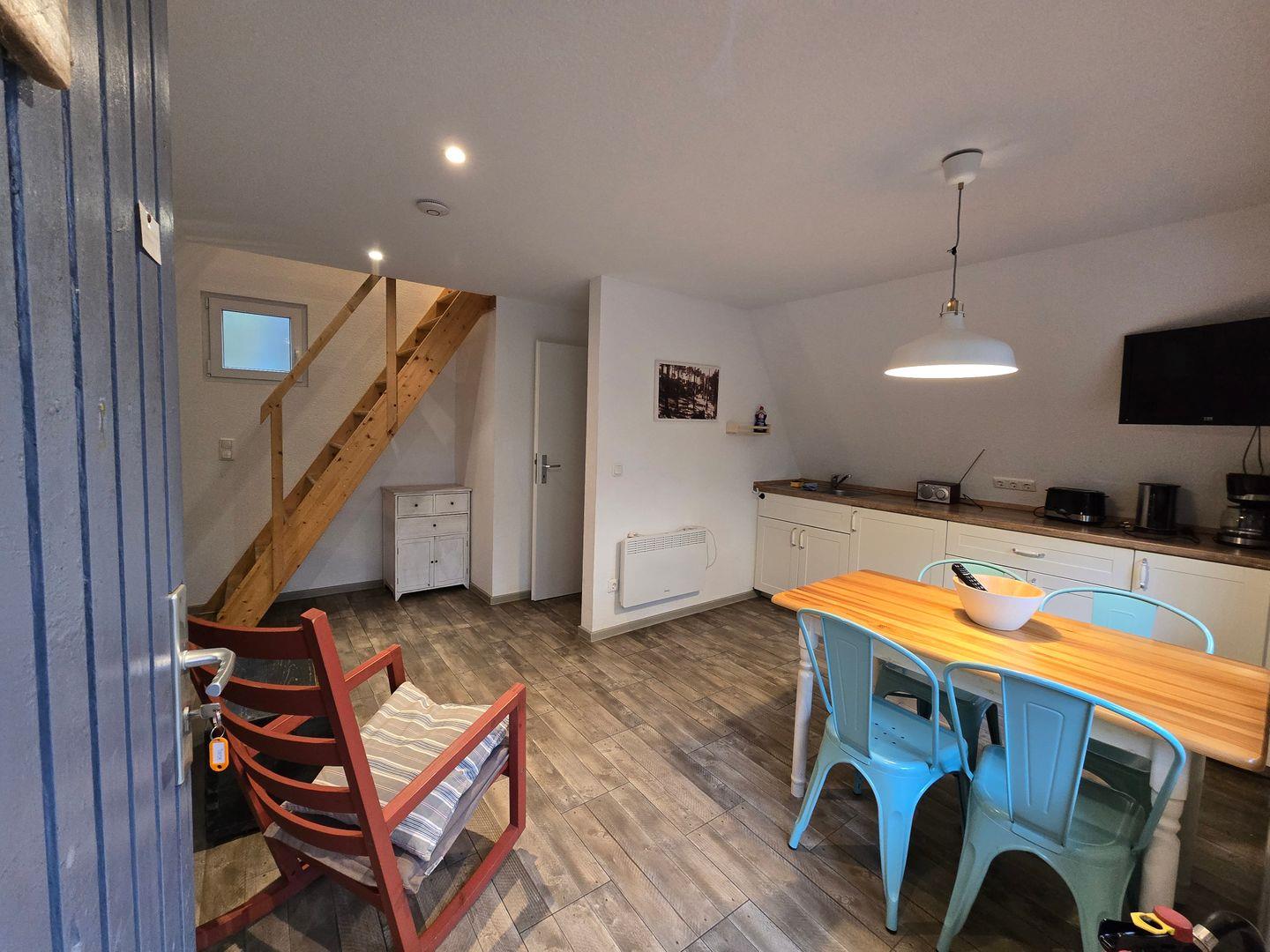 Drinnen warten ca. 30 m², die mehr können, als man denkt. Im Wohnzimmer treffen Sofa, Tisch und Stühle auf eine große Terrassentür, die den Wald direkt ins Haus holt. Die Schlafgalerie unterm Dach ist kuschelig und luftig zugleich – vier Betten für Erwachsene oder Kinder. IAlles schlicht, praktisch, ein bisschen skandinavisch – und mit Heizung für kühle Abende.