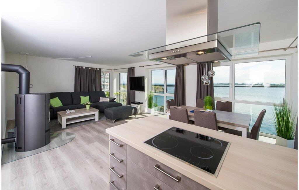 Drømmetid ved Østersøen. Denne moderne penthouse-ferielejlighed lever op til sit navn, da den udsatte beliggenhed, indretning af høj kvalitet og moderne indretning er lige så imponerende. Beliggende på den nordlige mole af Baltic Sea Resort Olpenitz, på et smalt næs midt i Østersøen, er denne særlige ferieejendom omgivet af vand. Ferielejligheden imponerer med en betagende udsigt over lystbådehavnen, slimmundingen og Østersøen, mens den forskudte etage med en stor solterrasse giver mulighed for at dvæle over havnebiografen og bølgerne. Udstyret med sauna, to pejse og badekar byder denne ferielejlighed på drømmetider i hver sæson. Indretningen af denne ferielejlighed er naturlig og klar og er bevidst enkel med naturlige materialer, klare former og dæmpede farver. Den rummelige og lyse stue/alrum er ferielejlighedens centrum og imponerer med gulv til loft-vinduer, et komfortabelt opholdsområde og et stort spisebord, alt sammen foran en unik vandkulisse. Det åbne køkken byder på alt, hvad en koks hjerte begærer af højkvalitets teknologi og udstyr. To soveværelser kan rumme op til fire voksne. Der er to ekstra sovepladser på den komfortable sovesofa på anden sal. Udover en bruser i gulvniveau byder hovedbadeværelset også på et personligt spa-program, da den store finske sauna sikrer wellness-øjeblikke. Et andet badeværelse byder på luksusen af et badekar. En trappe fører op til den forskudte etage, som giver ekstra opholdsrum. Gennem glasvinduet foran kan I nyde den betagende udsigt over den store terrasse på sejl- og sportsbådshavnen i ferieområdet, af Slien, dens udmunding i Østersøen og Schimmelünde fyrtårn. Penthouse-lejligheden inviterer jer til at blive hængende med et behageligt opholdsområde foran en knitrende pejs. Den store solterrasse, som omkranser tre sider, byder på alt, hvad jeres feriehjerte begærer, med heldagssol og en spektakulær udsigt over bølgerne, vidden og resortet. Der er to parkeringspladser til rådighed direkte foran huset. Vores favoritsted: Uanset om det er en varm sommeraften på terrassen eller en dyster novemberdag foran den knitrende pejs, er det forskudte gulv med en spektakulær udsigt vores højdepunkt i hver sæson. Traumzeit ferielejligheden ved Østersøen er en lejlighed på første og anden sal. Bemærk venligst: OstseeResort Olpenitz er meget populært, og der bygges fortsat i parken. Ikke desto mindre kan I se frem til en 5-stjernet standard og et førsteklasses ophold. Byggeaktiviteterne kommer ikke til at forstyrre jer på ferien, og derfor gives der ikke yderligere afslag i prisen.