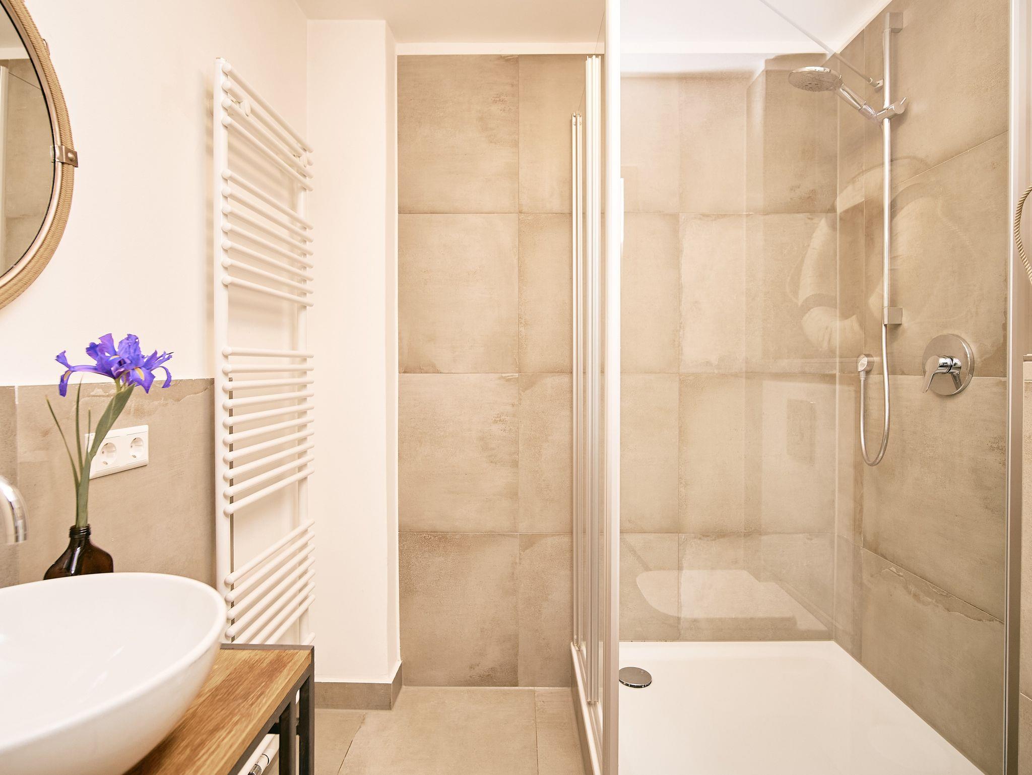 1 Badezimmer mit Dusche, Toilette, Waschbecken