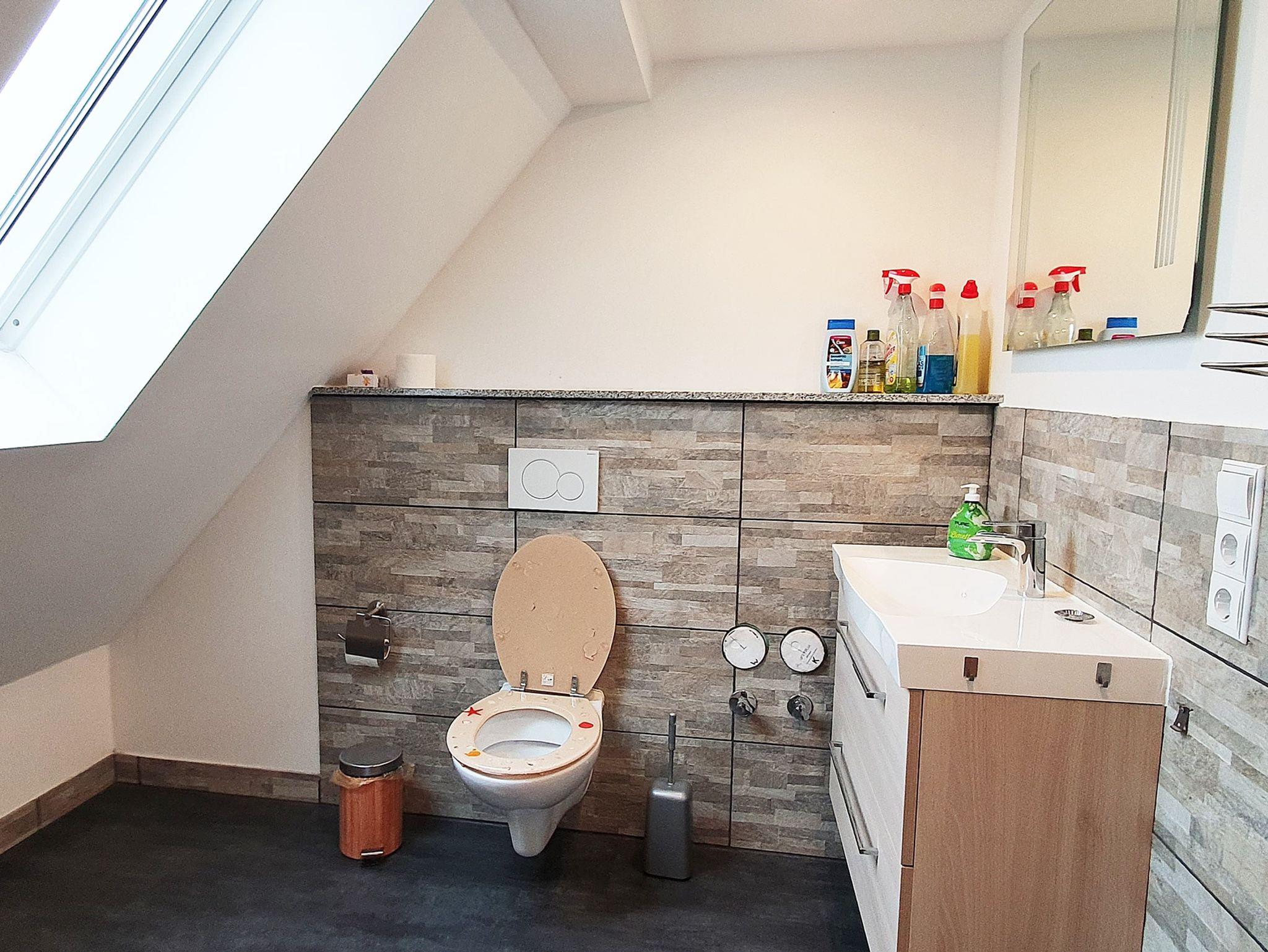 Im zweiten Obergeschoss sowie im Dachgeschoss befindet sich eine weitere Ferienwohnung mit ca. 45m² die mit zwei Personen belegt werden können. Großer und heller Wohnraum mit offener Küche, Essbereich und Wohnzimmer sowie einem Badezimmer mit Dusche und WC. Das Schlafzimmer mit Doppelbett befindet sich im Dachgeschoss und kann über eine steilere Treppe erreicht werden. Herrlicher Blick auf die umliegenden Chiemgauer Berge. Geschirrspüler, Toaster, Wasserkocher und Mikrowelle vorhanden.