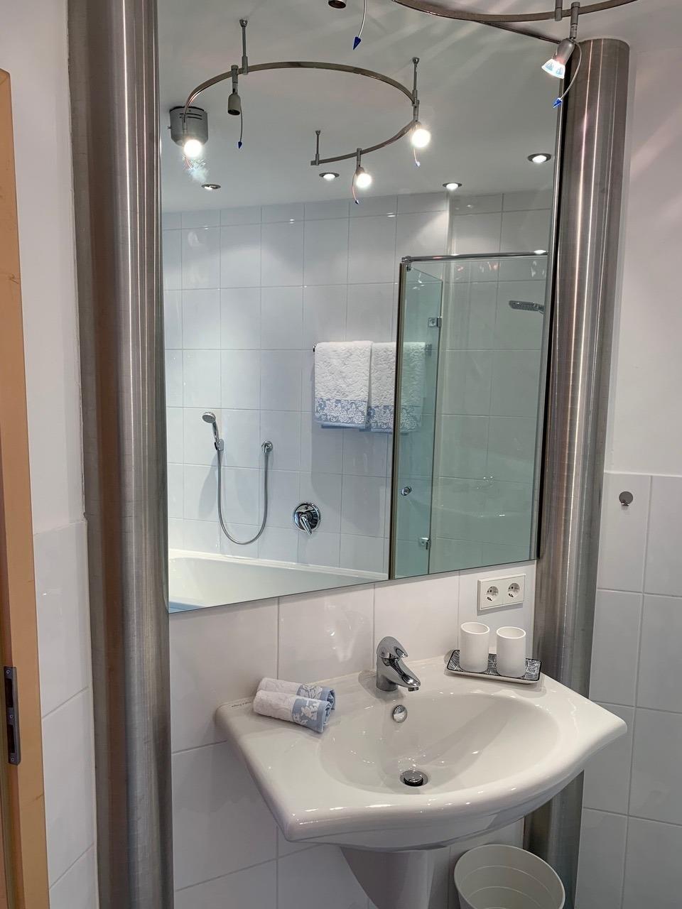 Das helle Bad hat eine separate Dusche und Badewanne und Waschmaschine, ein Föhn ist vorhanden.