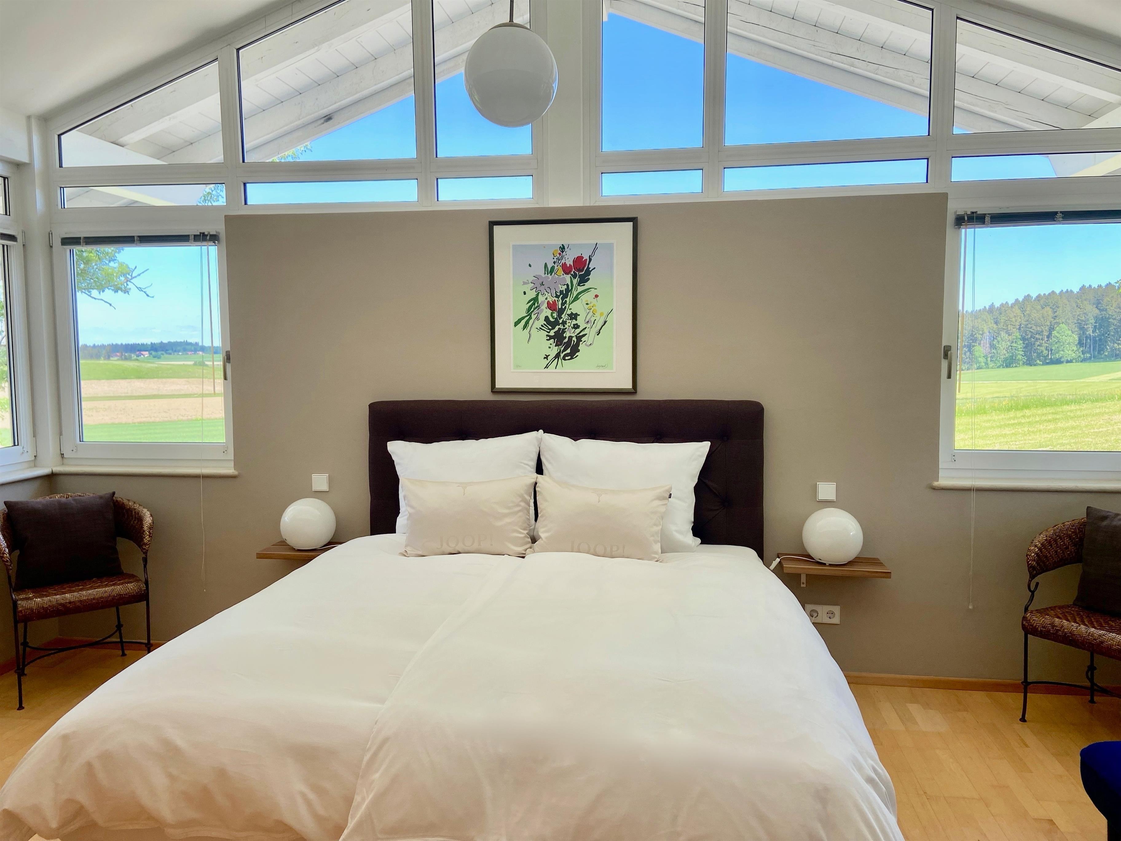 Die Ferienwohnung "Am Einhamer Kreuz" liegt auf einer Anhöhe südwestlich am Stadtrand von Traunstein und bietet Ihnen einen wunderschönen Blick auf den Chiemsee und die Berge.